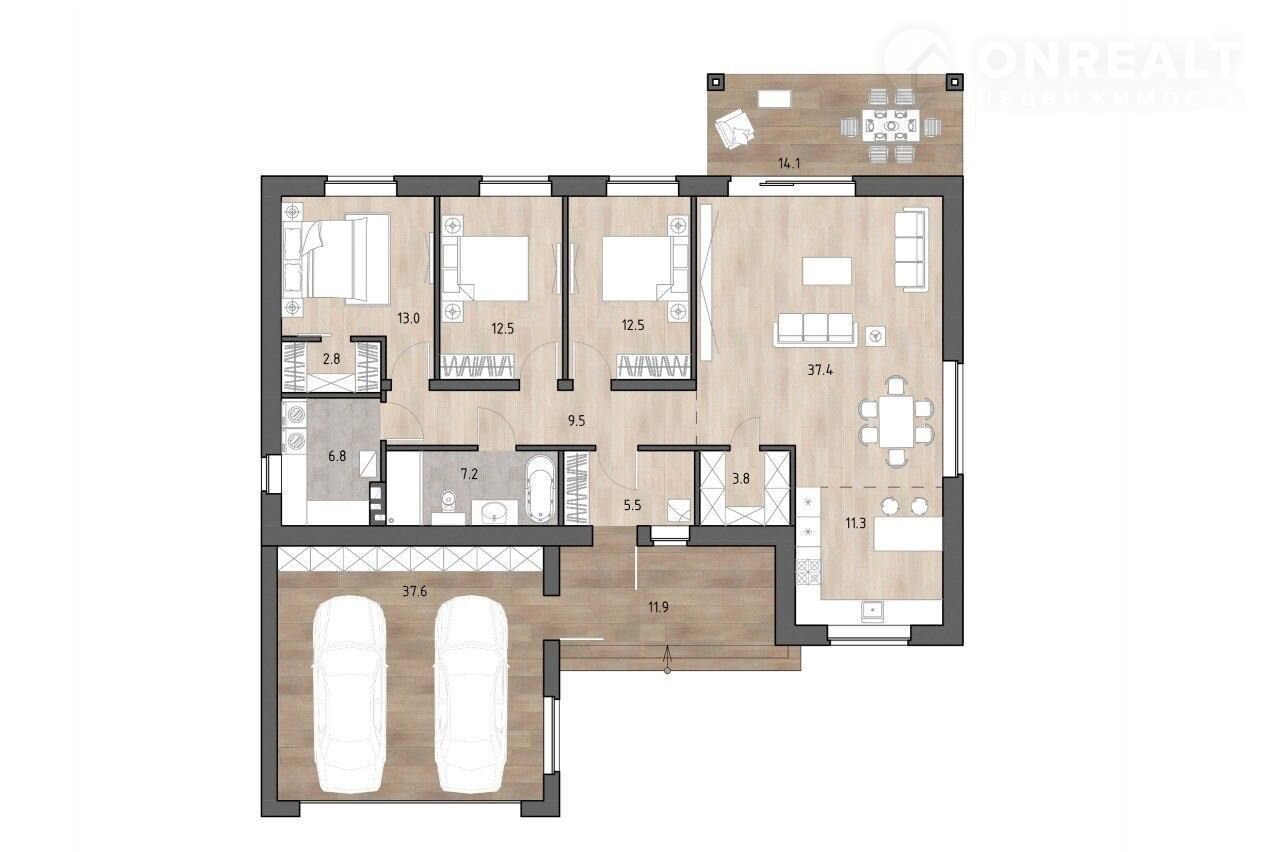 В доме 3 спальные комнаты , просторная кухня-гостиная , гардероб , санузел и котельная . Родительская комната разделяется с детскими санузлом .