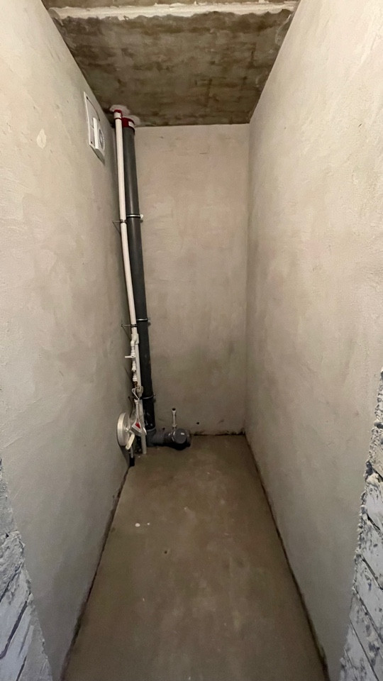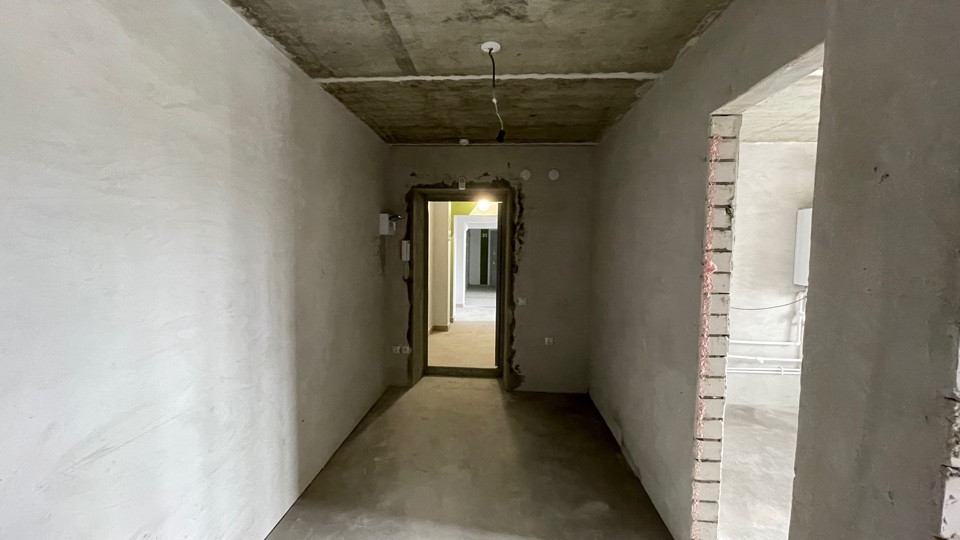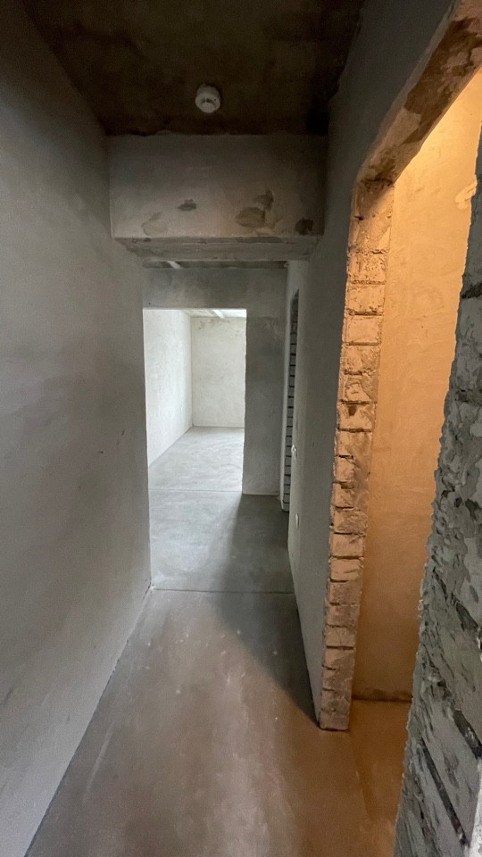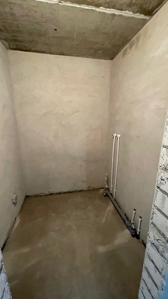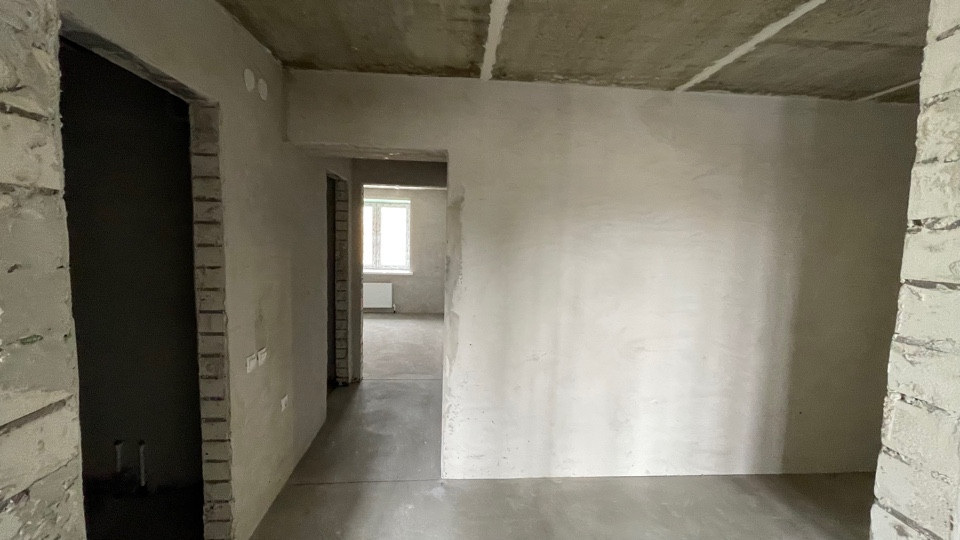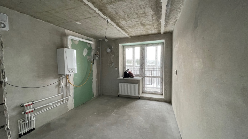 Пол ровный полусухая стяжка, стены отштукатурены, отопление и горча вода от котла "BAXI", радиаторы отопления установлены, розетки и включатели имеются.