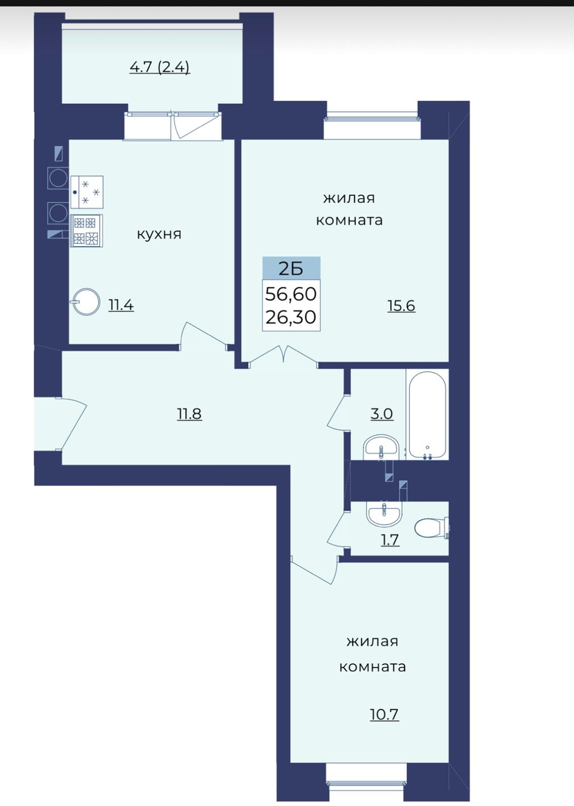 Общая площадь 56.6 м2