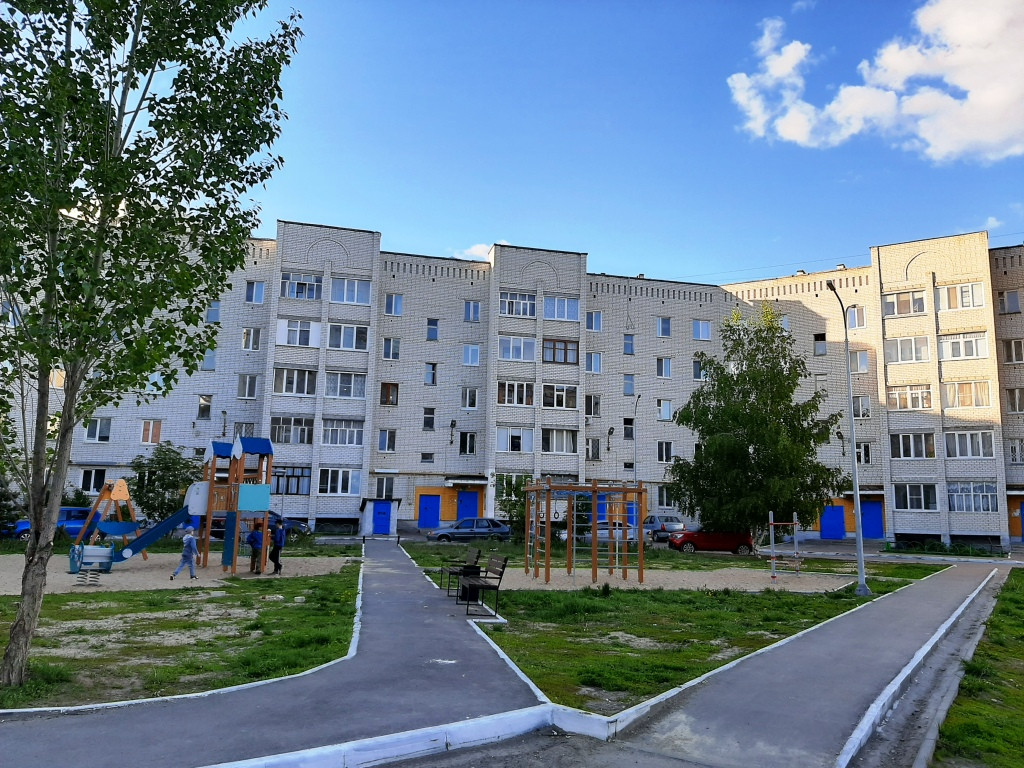 Благоустроенная детская площадка во дворе Много места для авто.