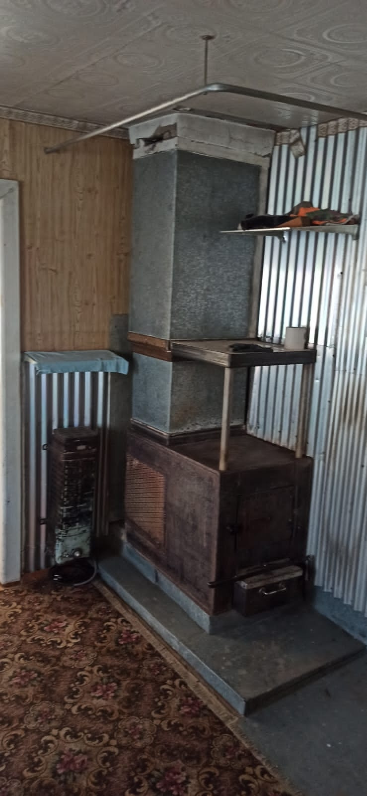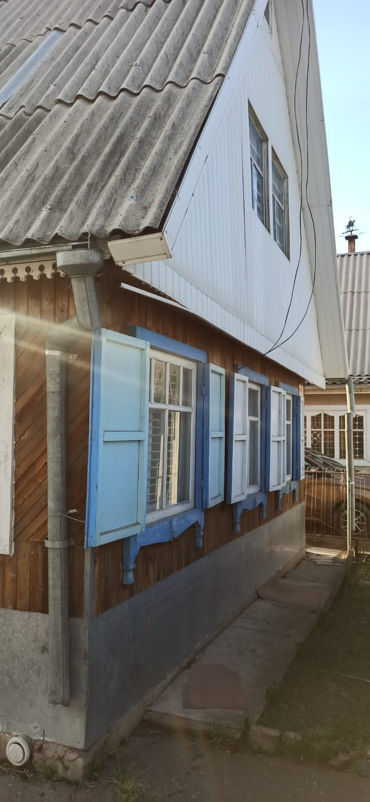Дом на два этажа, S = 36.7 кв.м.: первый этаж из бруса второй мансарда, на первом этаже комната, кухня, веранда и коридор. Большая железная печка внутри обложена кирпичом обогревает сразу весь дом на первом этаже. Второй этаж мансардный одна комната и хоз. помещения. Подвал выложен кирпичом. Парковка во дворе на два автомобиля, заасфальтирована. Так же заасфальтирована дорожка от дома к бане.