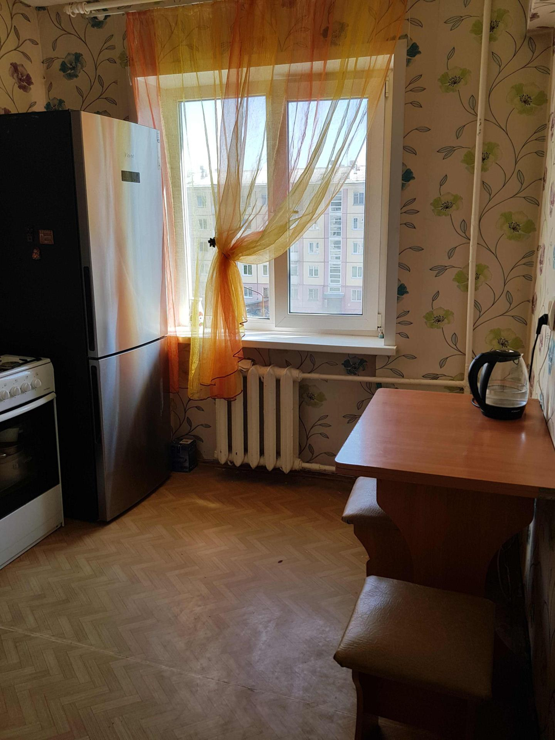 В квартире установлены счётчики на воду, трубы заменены. На кухне установлено пластиковое окно с москитной сеткой. в зале окно деревянное.
