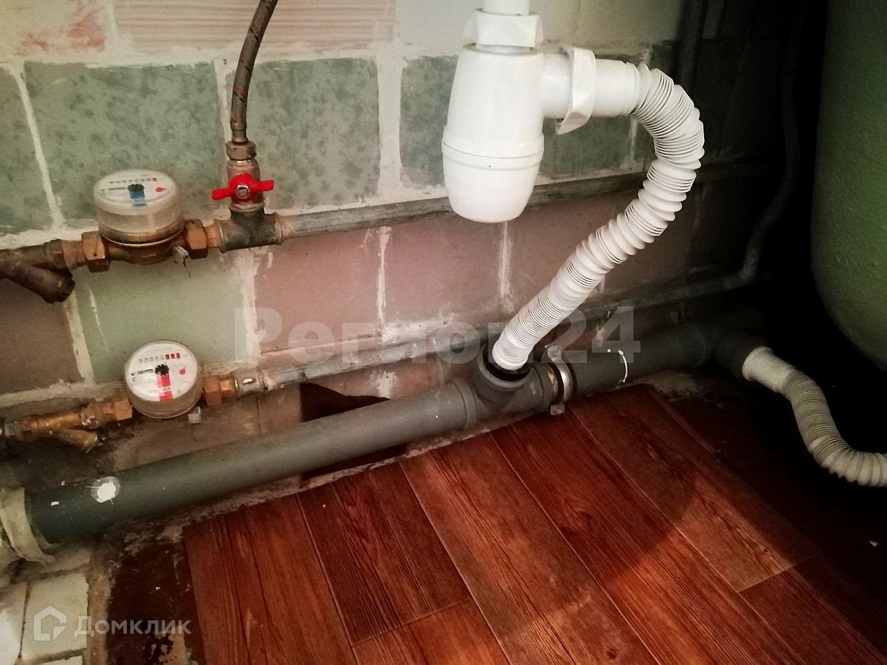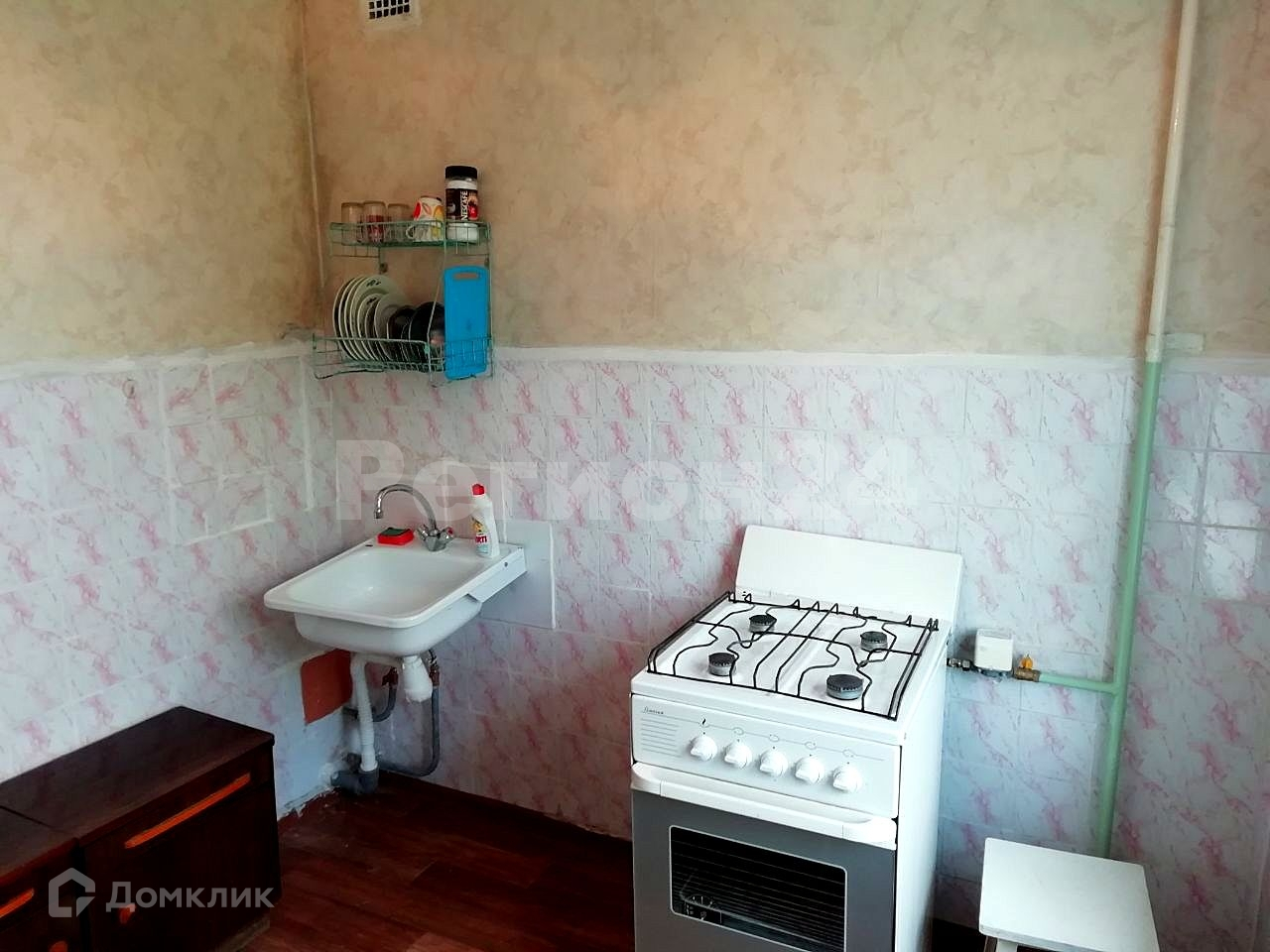 » На кухне по периметру стены выложены до середины плиткой, к плите подведён газовый счётчик.