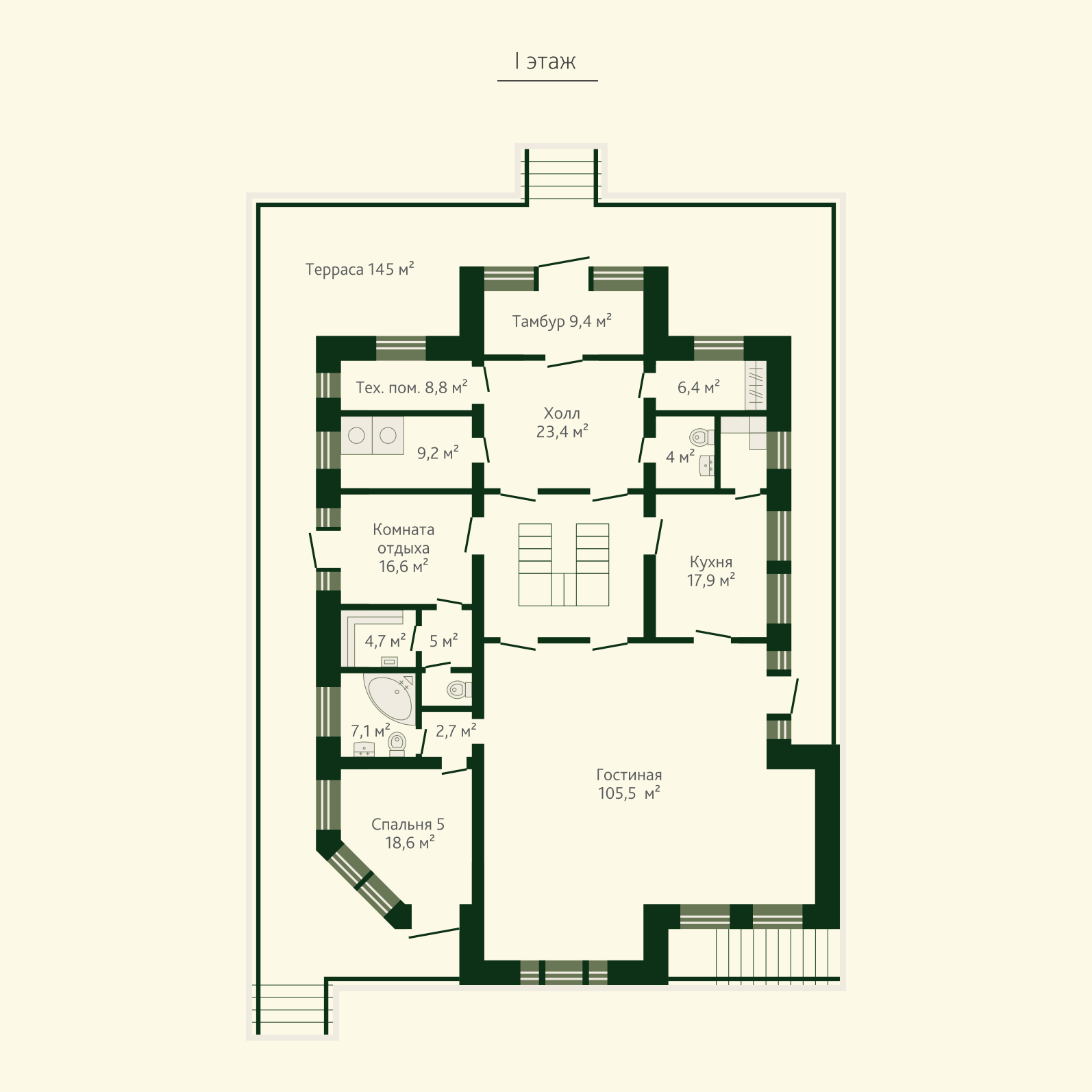 Заглубленный железобетонный цокольный этаж (площадь 283 кв.м., высота потолков - 2,39 м.) позволит разместить не только спа-зону, домашний кинотеатр или винный погреб, но и реализовать все пожелания владельца по системам безопасности,  здесь может быть обустроена комната-сейф или частный бункер.
