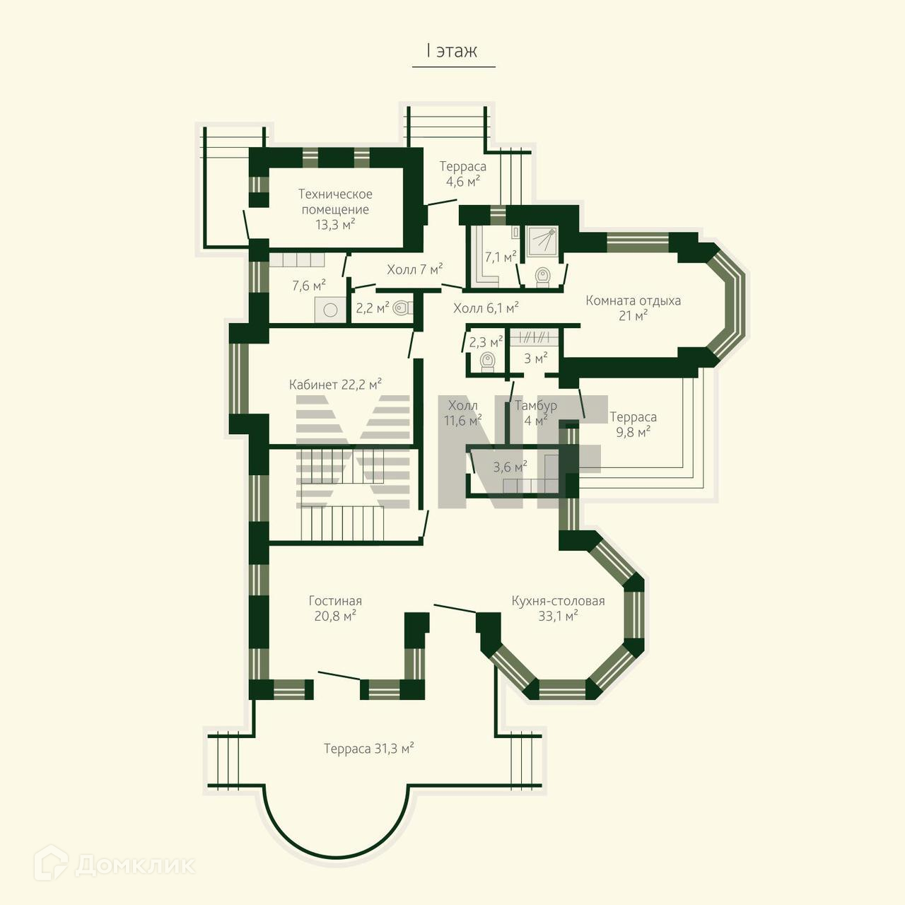 По проекту на первом этаже предполагается: гостиная, кухня-столовая с выходом на террасу площадью 31 кв.м., кабинет, гостевая спальня, техническое помещение, постирочная, 3 с\у.