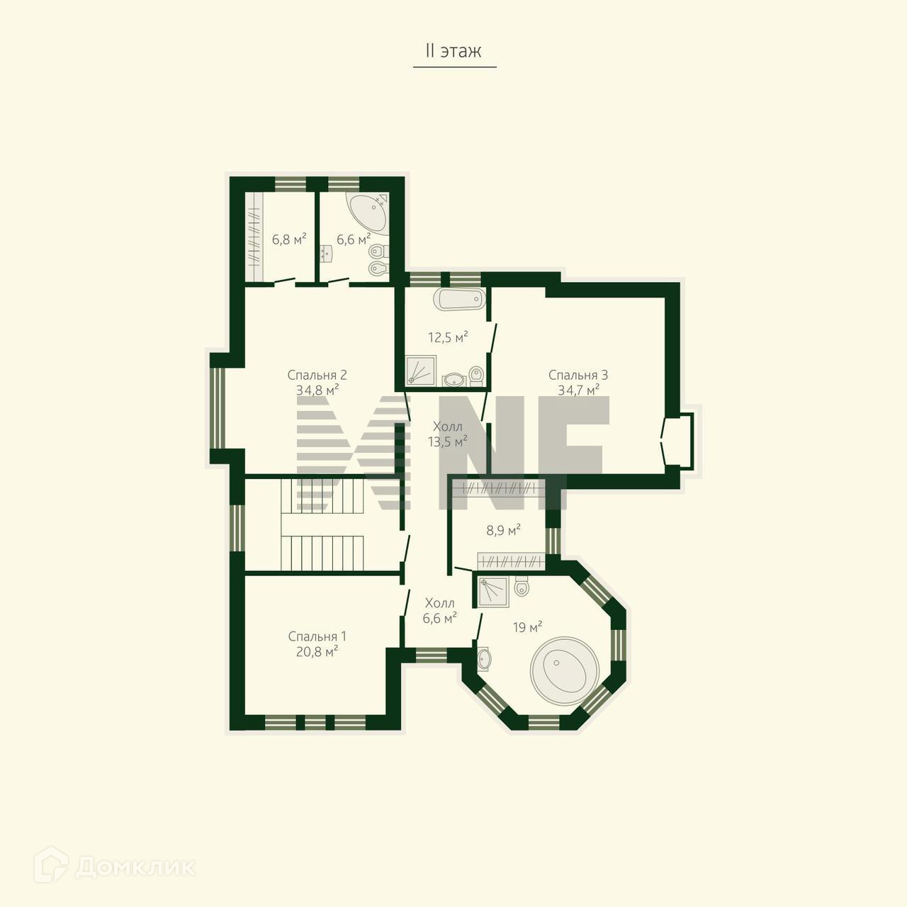 На втором этаже: 3 спальни, каждая со своей ванной комнатой и гардеробной.