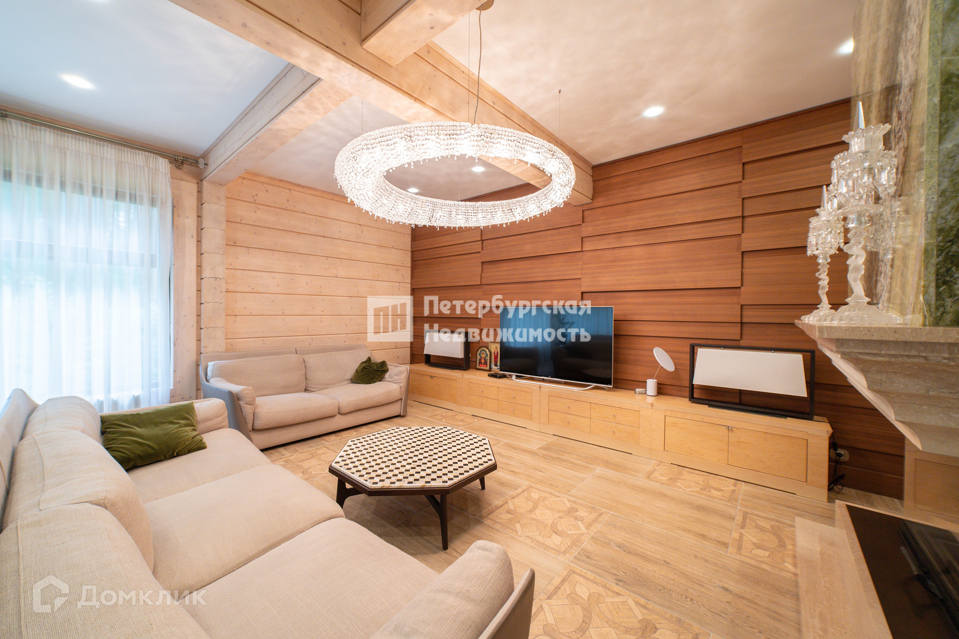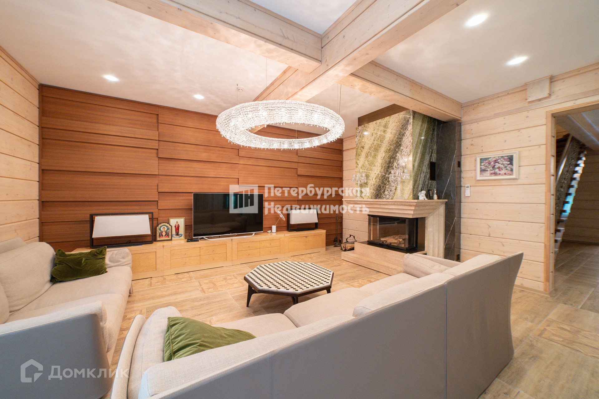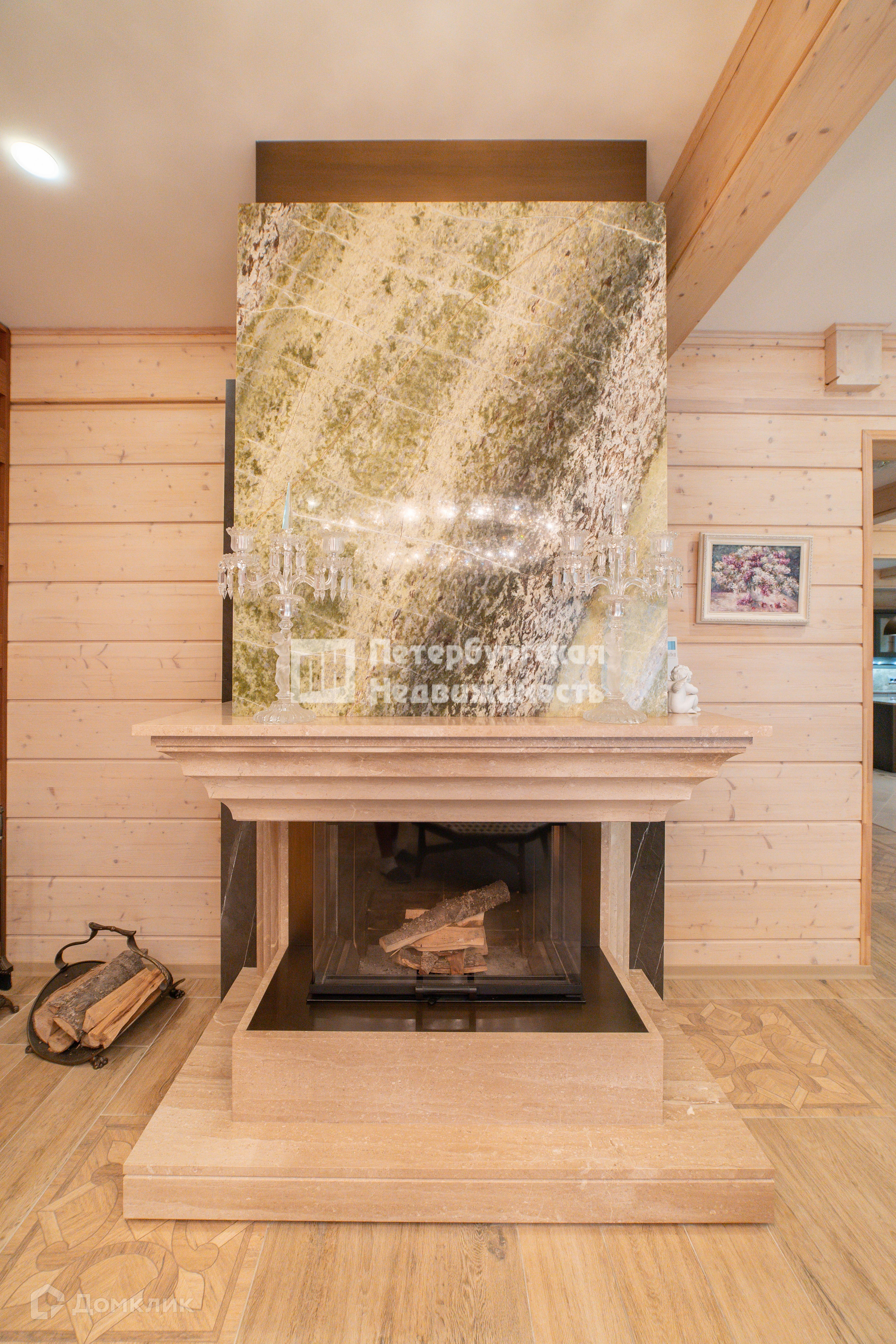 Просторная гостиная 33.6 m2, с действующим мраморным камином, которая станет местом притяжения.