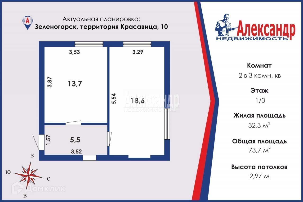 Жилая площадь 32.3 м2