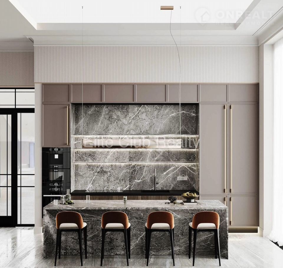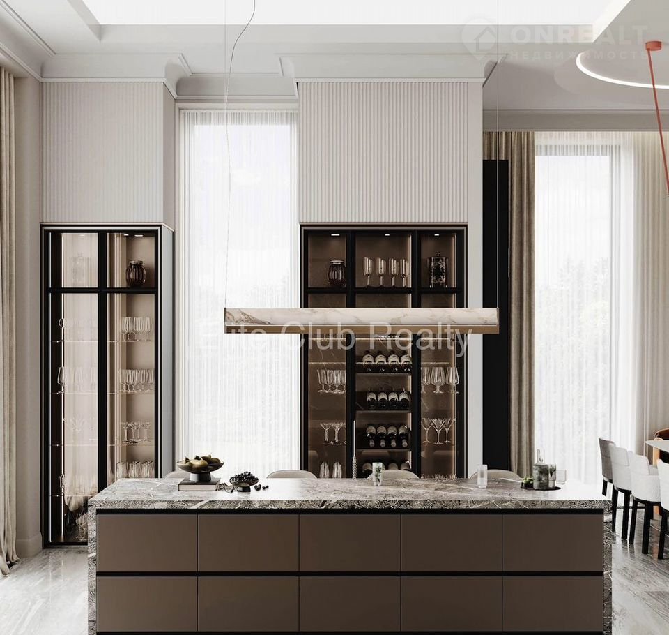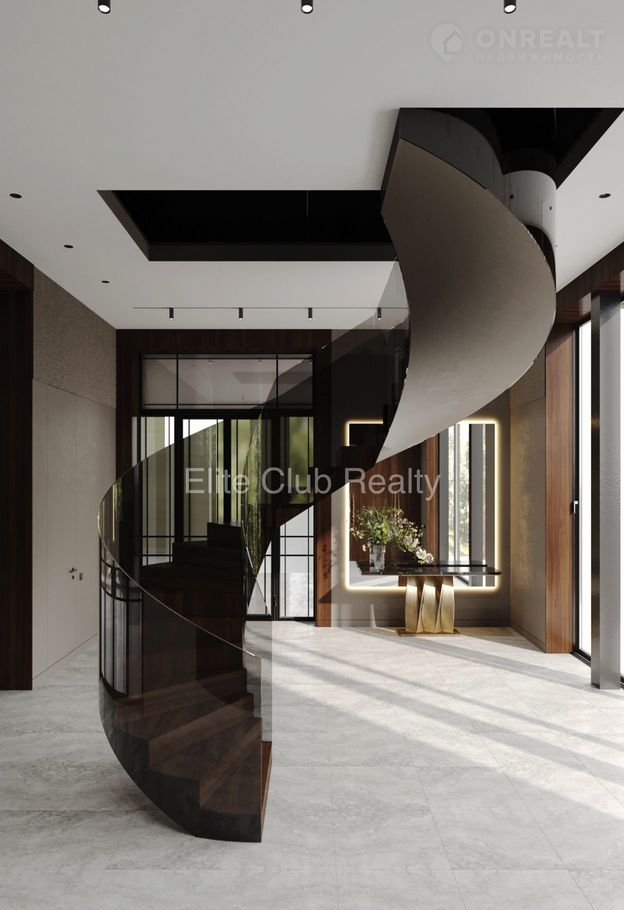 * 1 этаж: холл с 4‑метровыми потолками, эффектная винтовая лестница, кухня с премиальной встроенной техникой и мраморным островом, обеденная зона на 12 персон, гостевая спальня с санузлом, закрытый бассейн с панорамным остеклением и выходом на террасу.