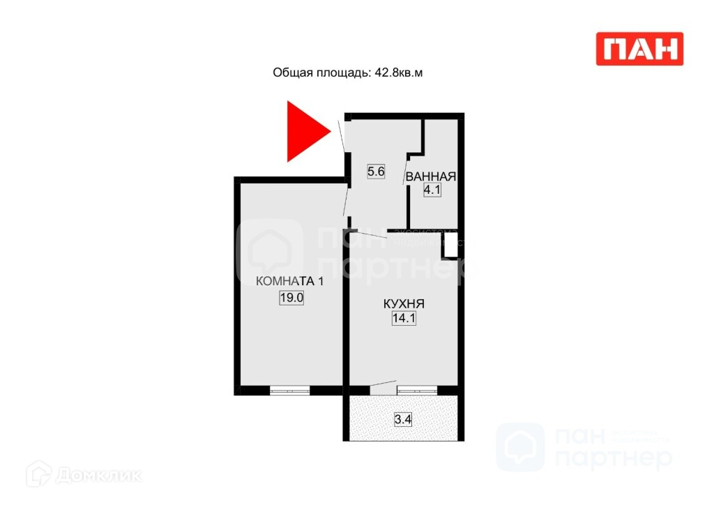 Общая площадь 42.8 м2