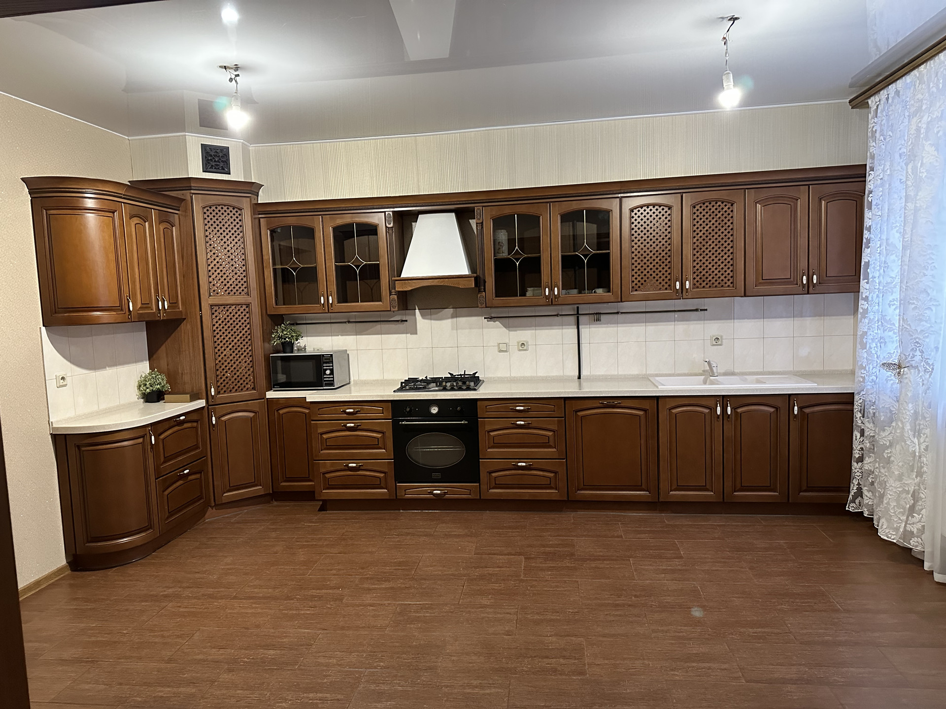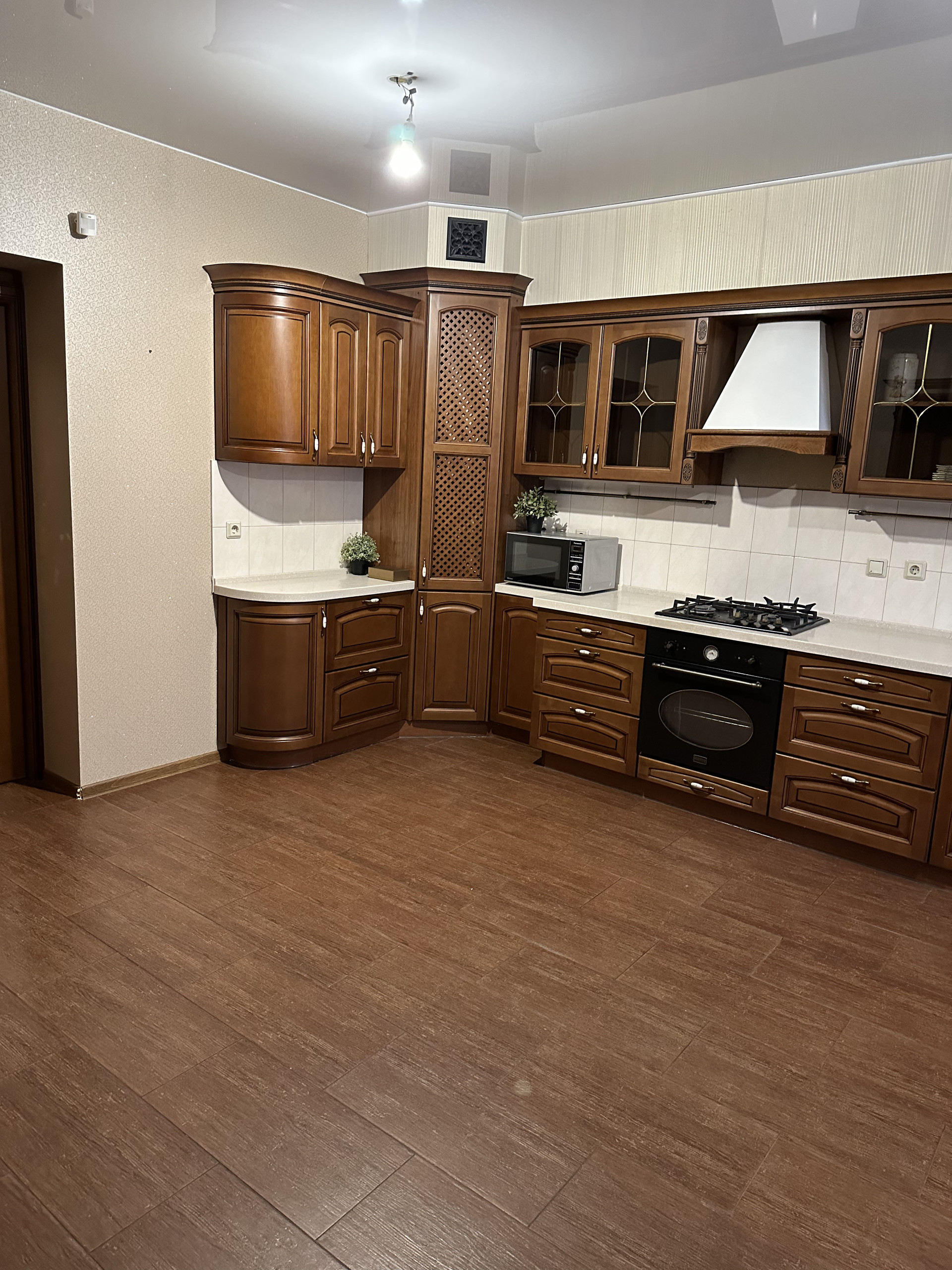 • На кухне кухонный гарнитур в отличном состоянии со светодиодными светильниками. Массив бука.