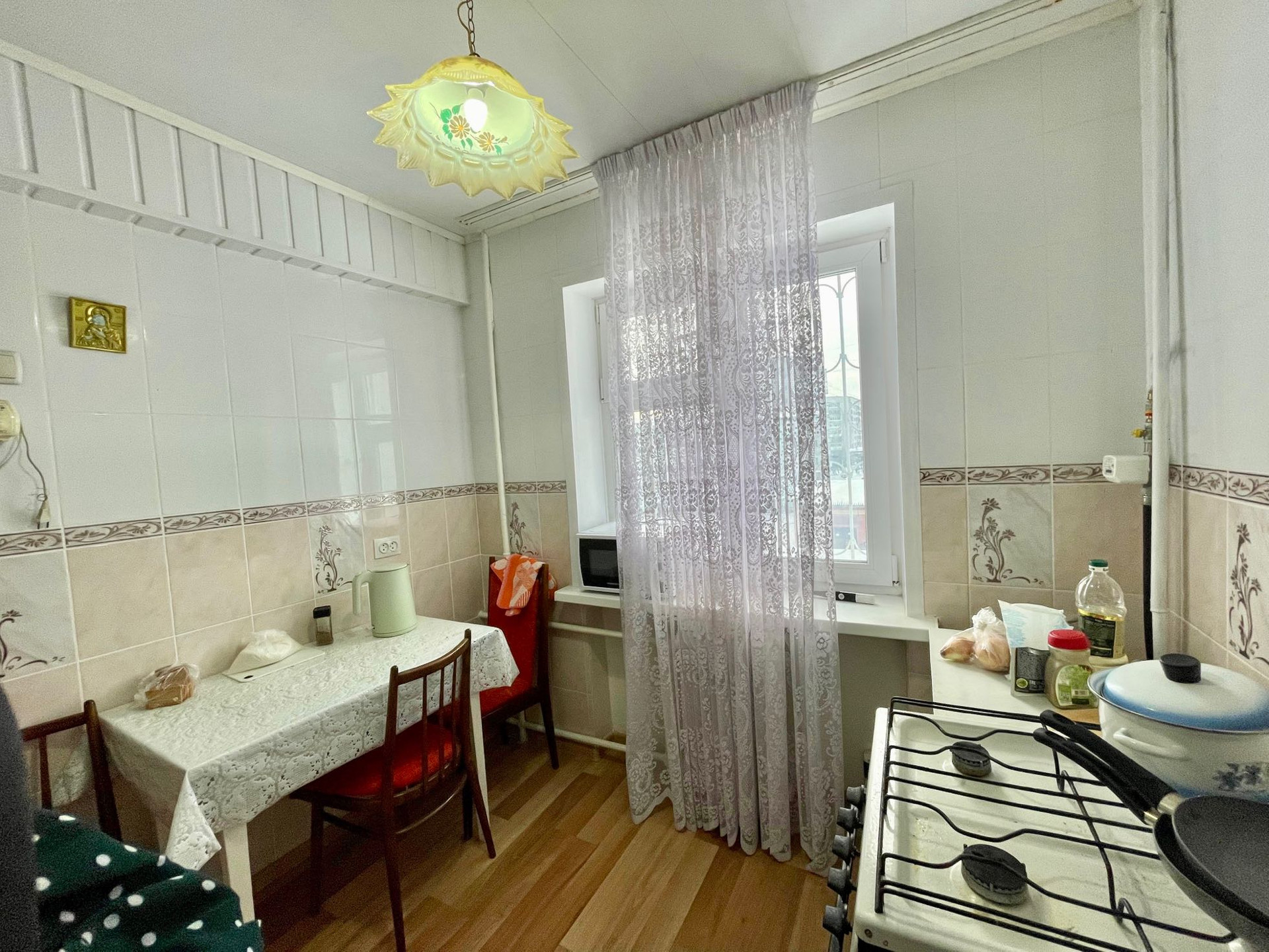 На кухне: столовая зона, газовая печь, места для хранения, чайник, микроволновка, небольшой набор посуды.