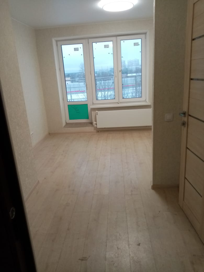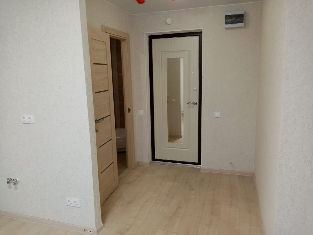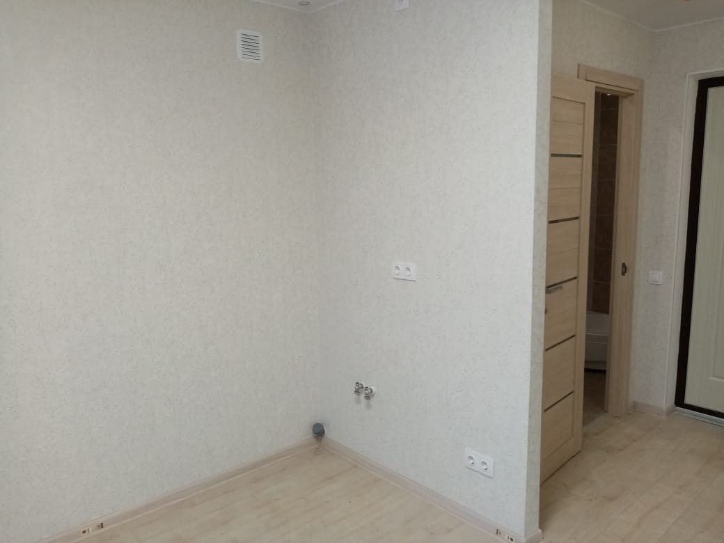 Студия с балконом, хорошая отделка: ламинат 33 класс, натяжные потолки, качественные стеклопакеты, светлые обои, установлена сантехника, выключатели, розетки, плафоны.