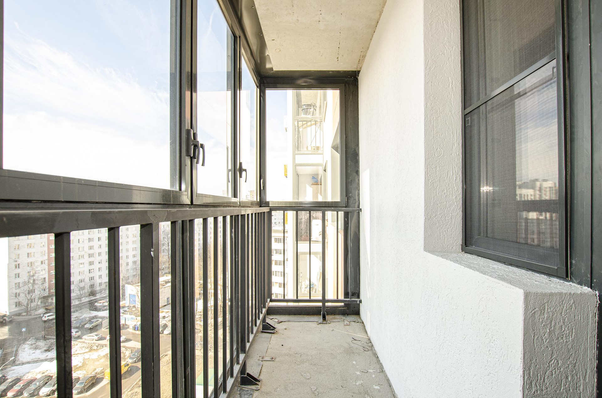 - Балкон с панорамным остеклением, окна во двор