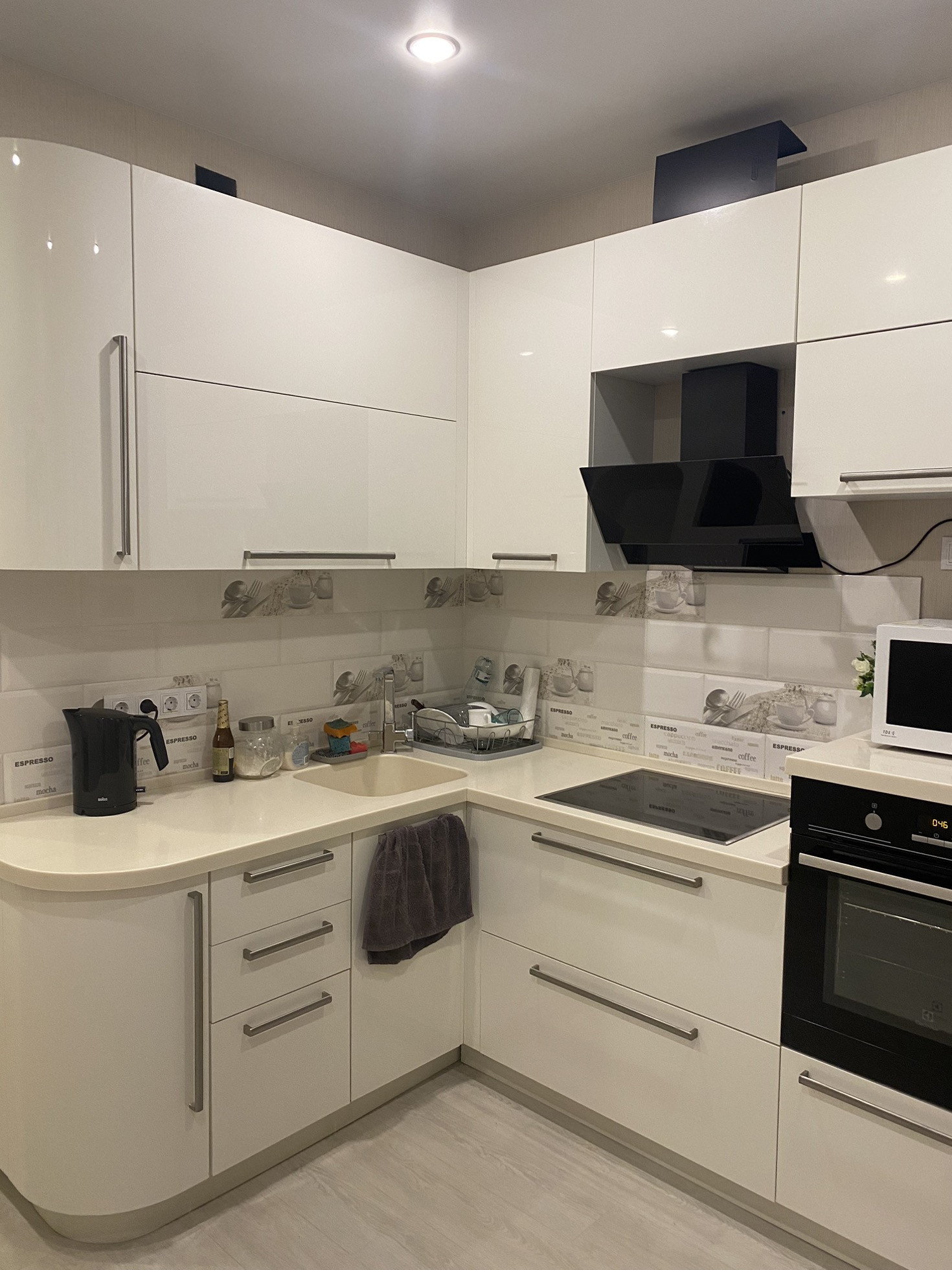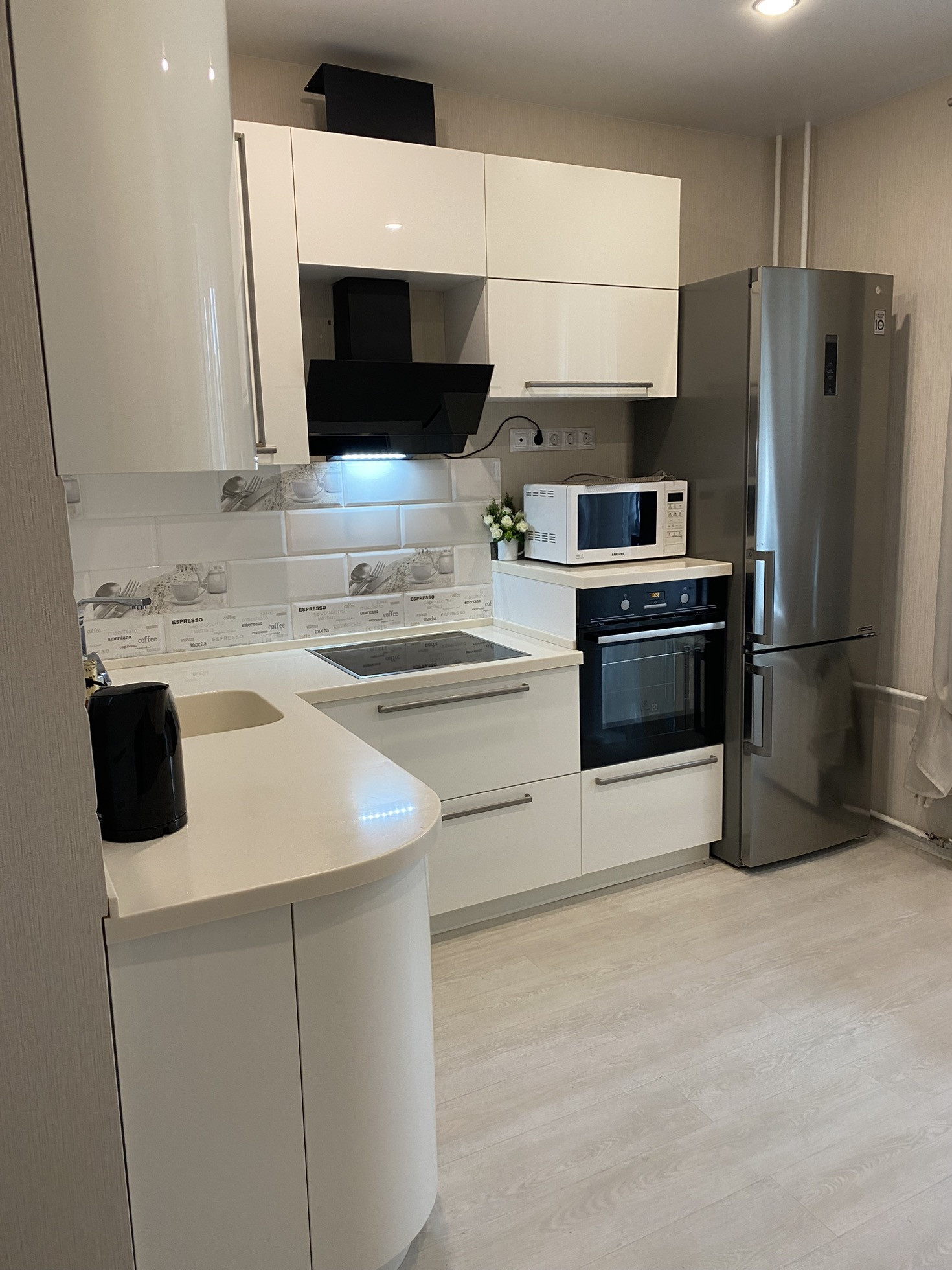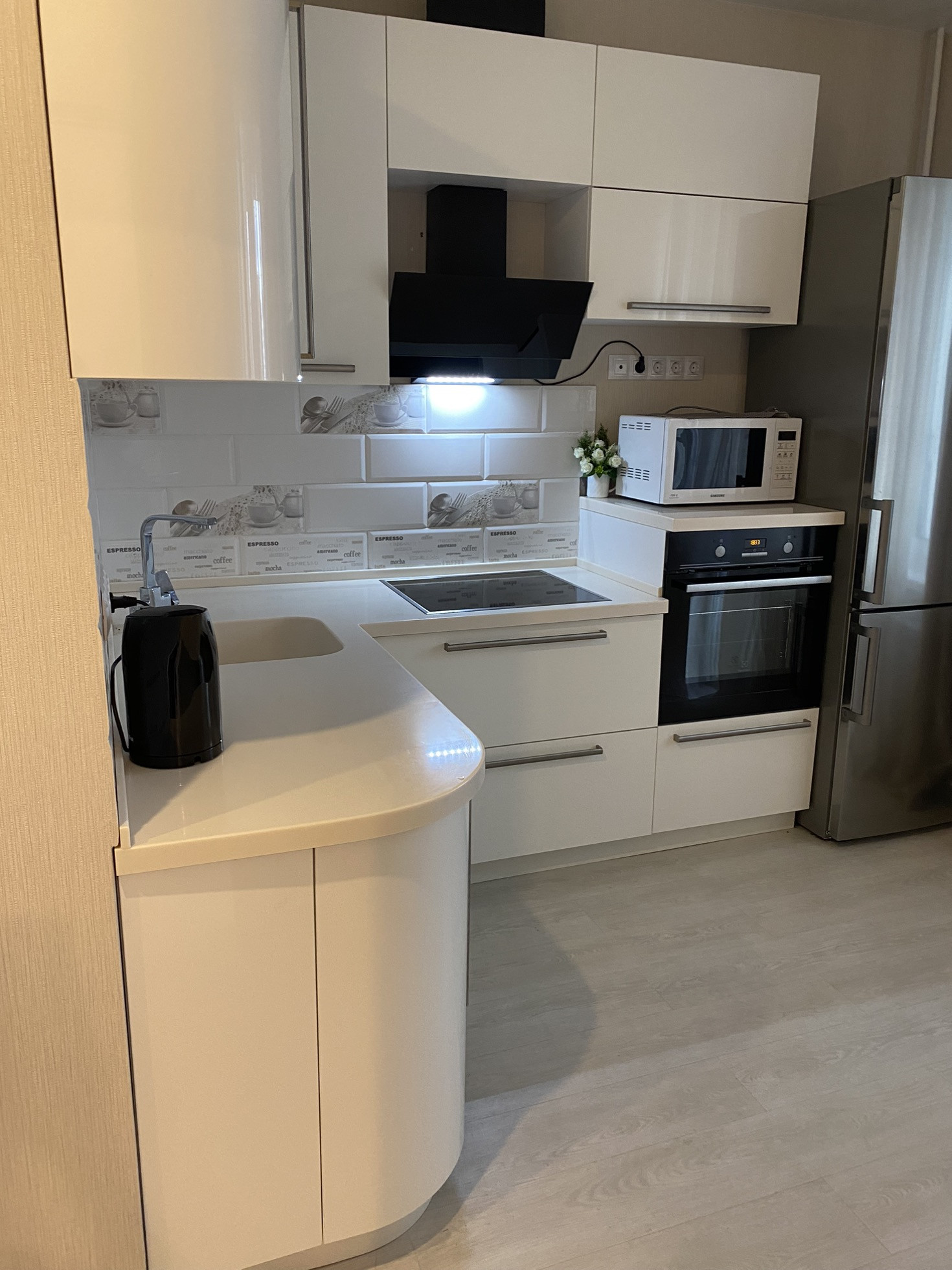 - акриловая кухня с дорогой качественной техникой, столешница из искусственного камня с интегрированной мойкой;