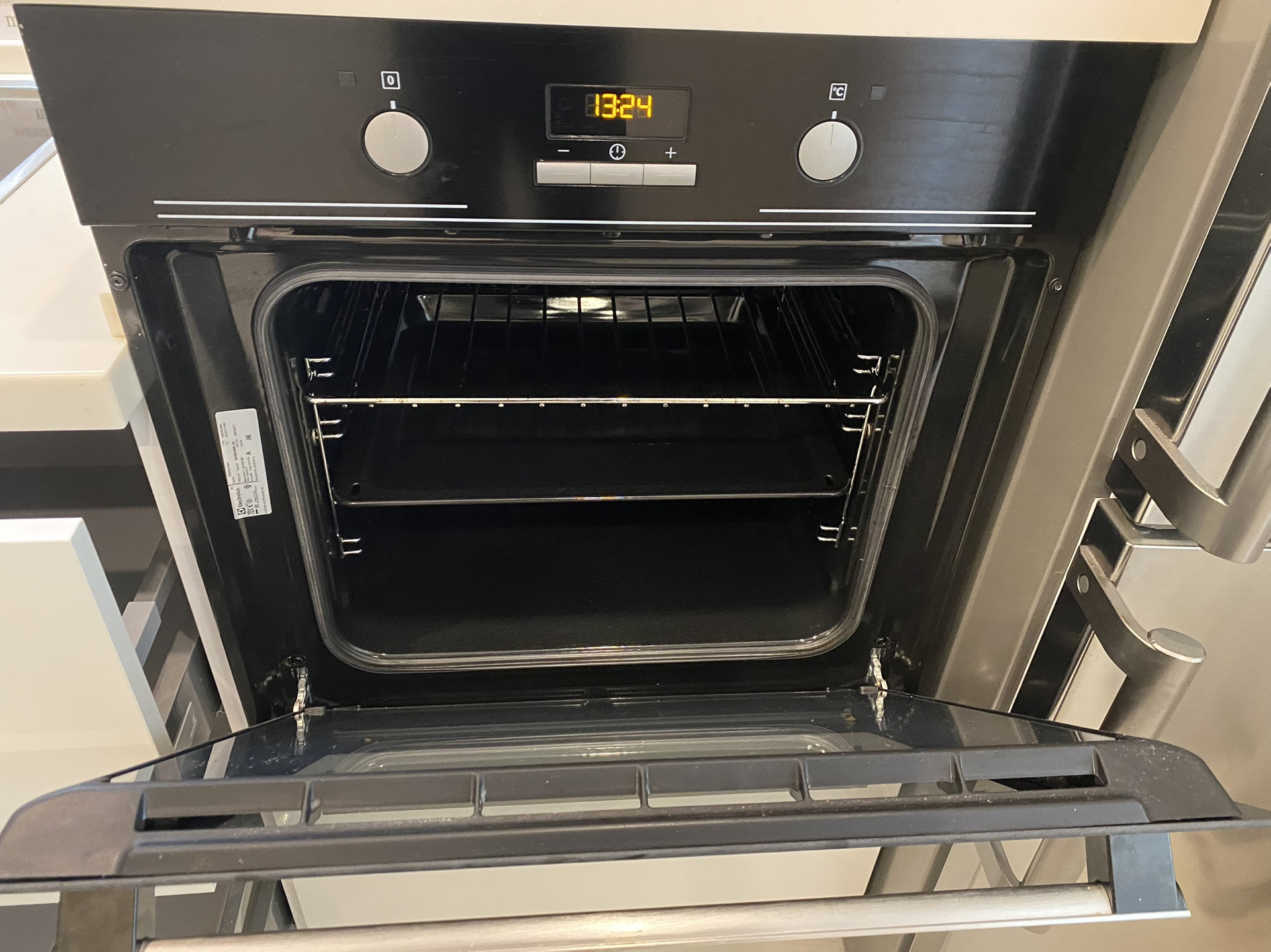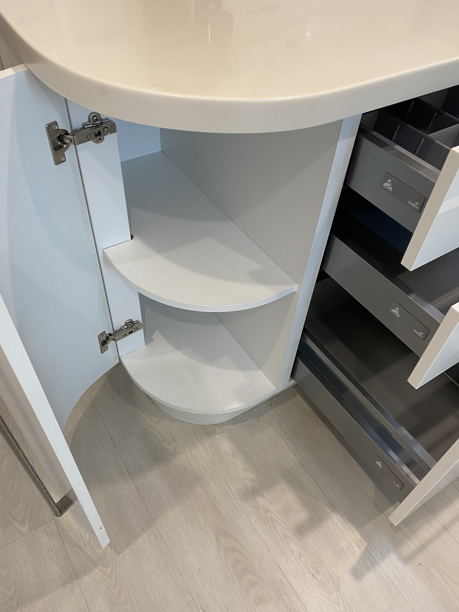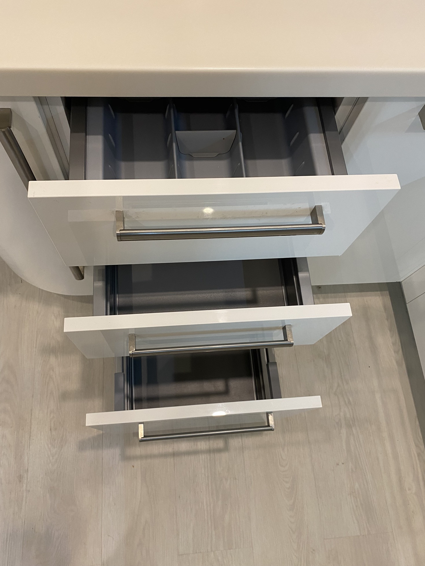 - акриловая кухня с дорогой качественной техникой, столешница из искусственного камня с интегрированной мойкой;
