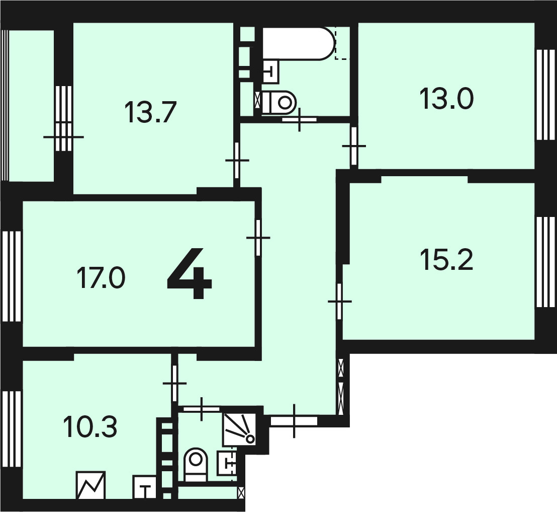 Кухня 10,3м2, комната 17м2+13,7м2+13м2+15,2м2, два сан.узла, лоджия. Детские и спортивные площадки и территории для отдыха. В пешей доступности все для комфортного проживания: школы, д/сады, колледжи, магазины, поликлиники, медицинские центры, кафе и рестораны.