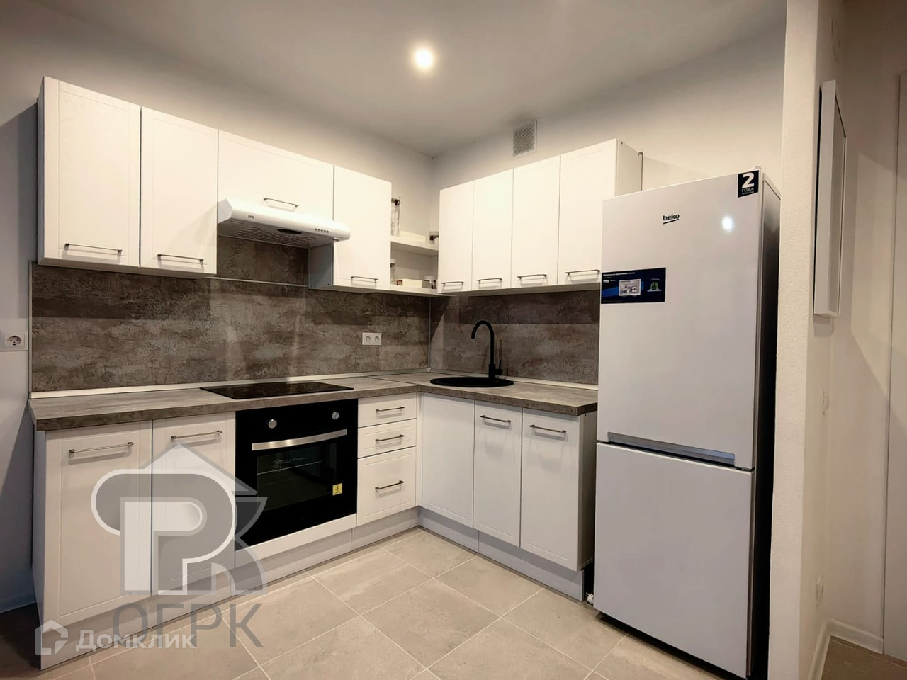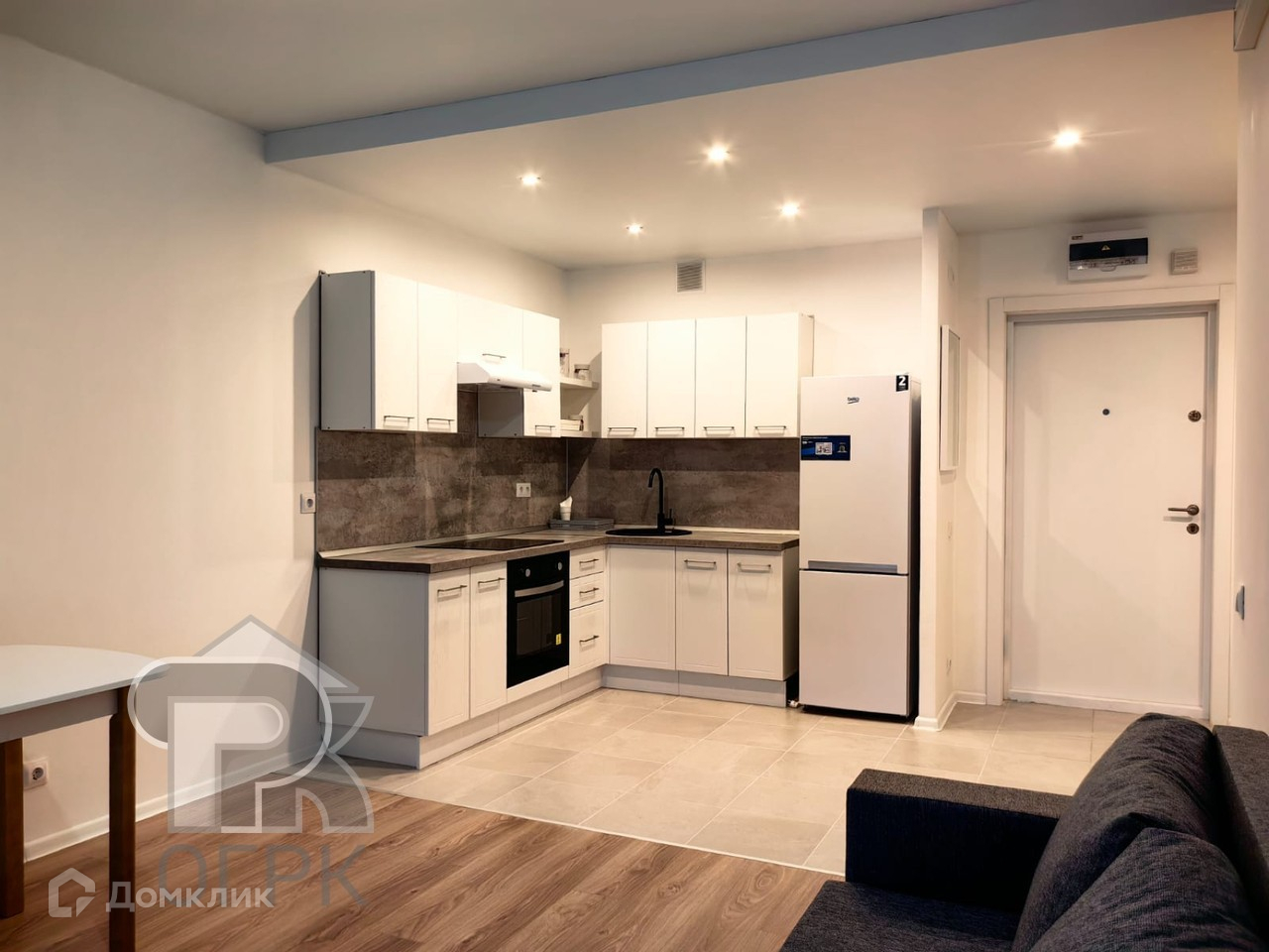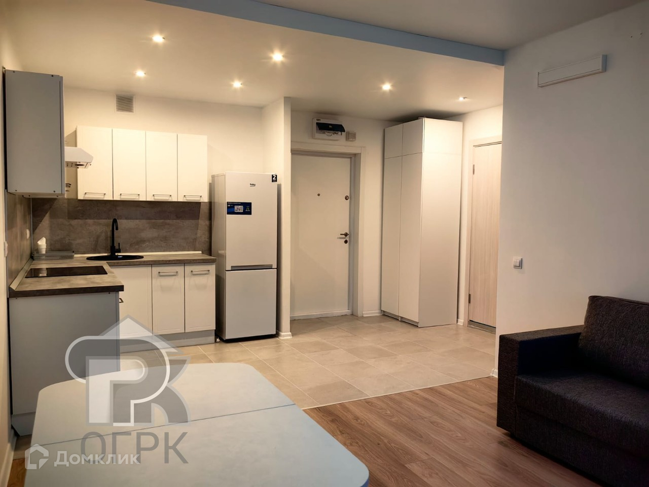 Квартира оборудована всей необходимой для проживания мебелью и техникой: есть кухонный гарнитур, плита, стиральная машина, холодильник, шкаф, диван и стол со стульями.