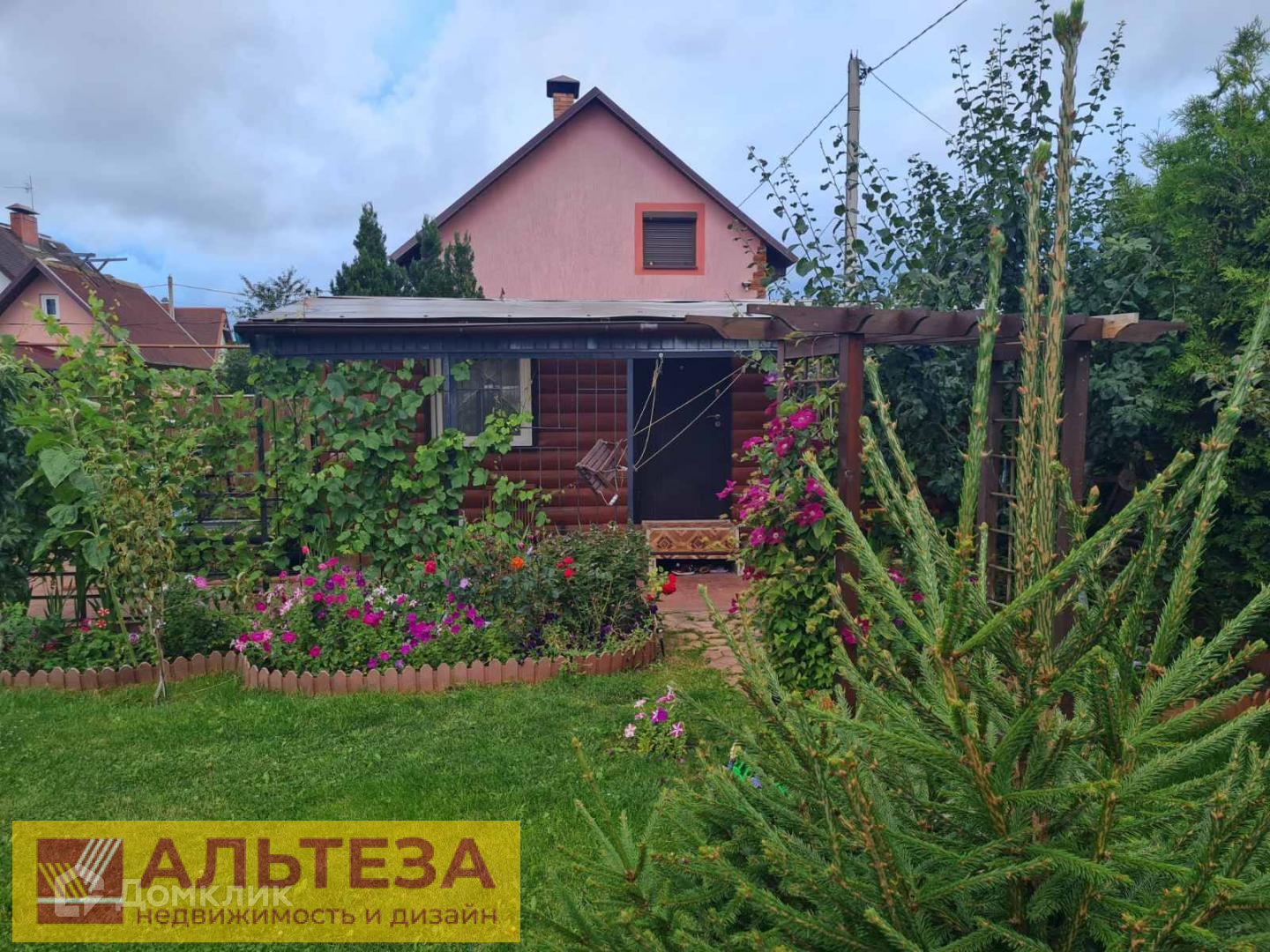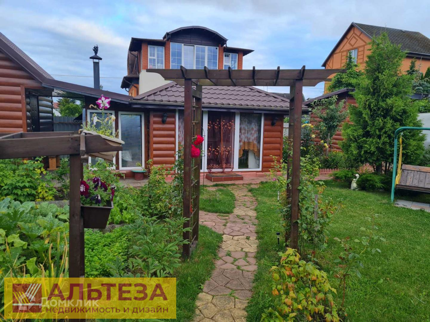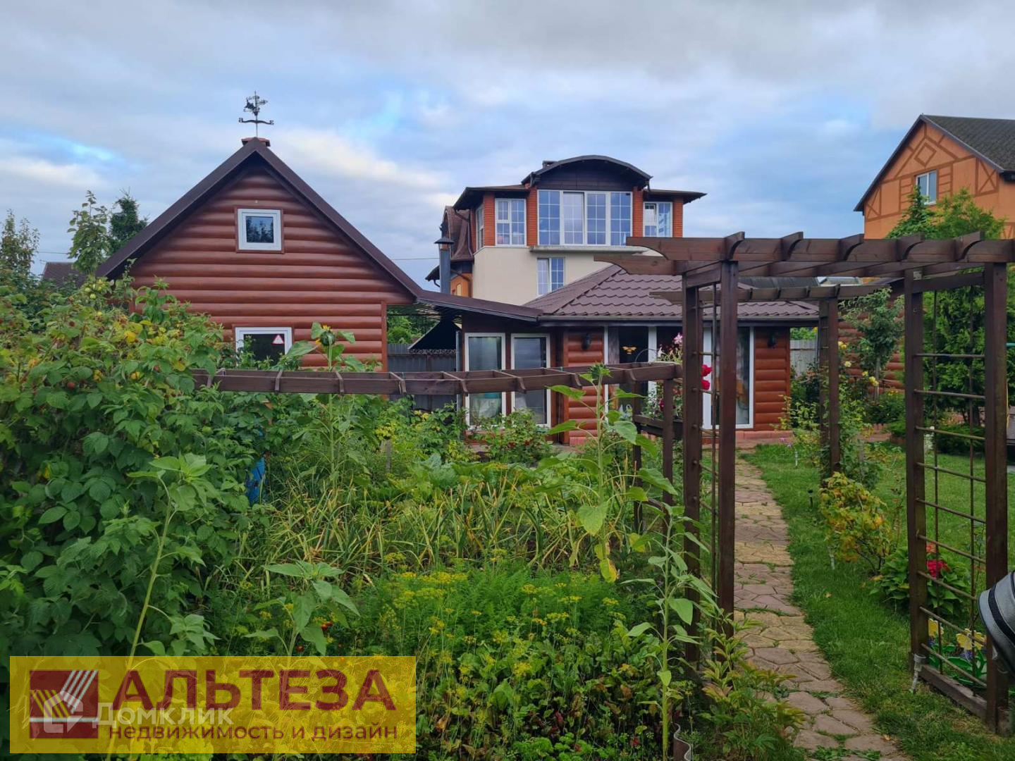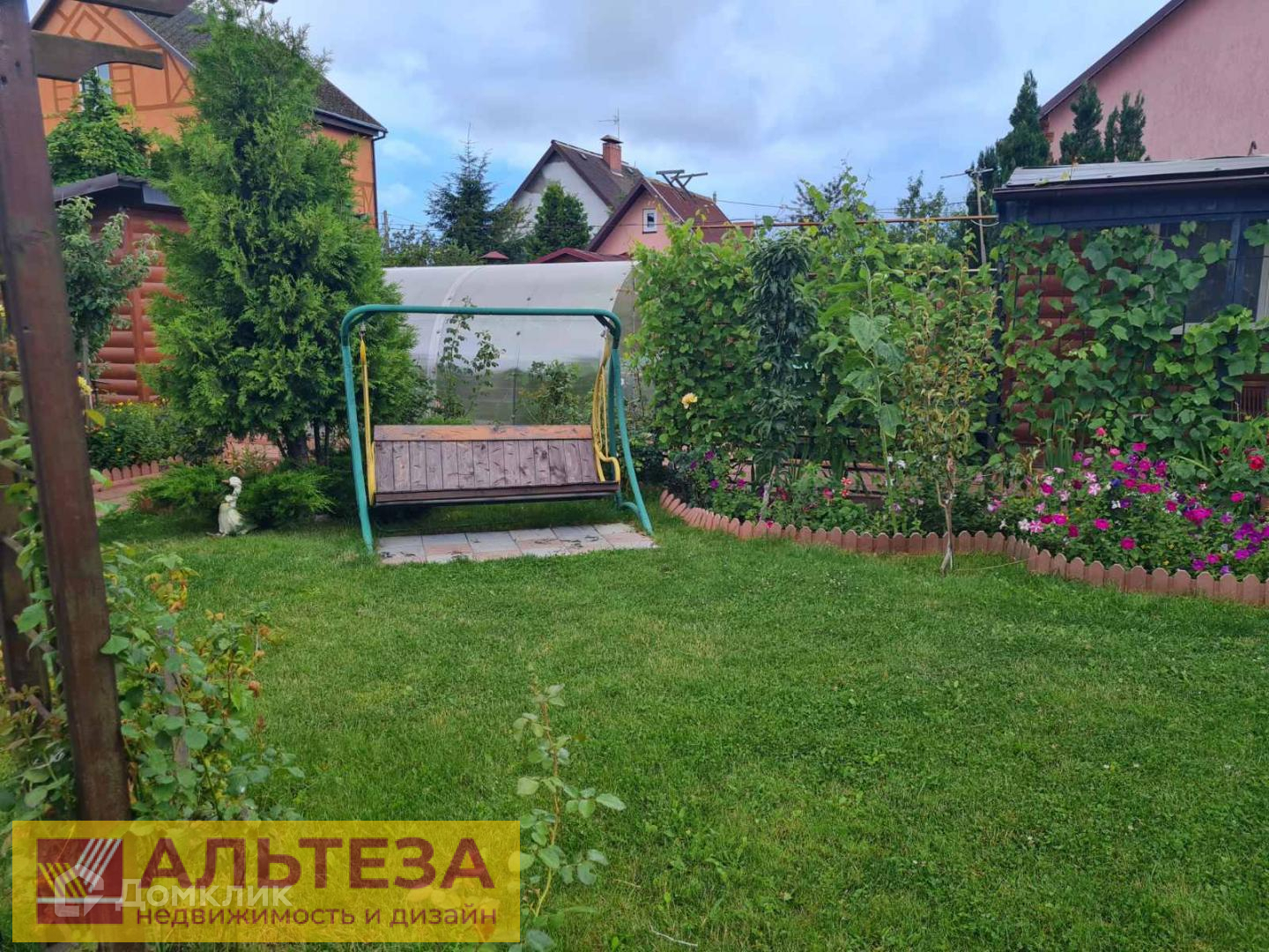 Сад — 2 большие теплицы, плодово-ягодные кустарники (смородина, малина, голубика, клубника, виноград несколько сортов), молодые деревья (груши, яблони, слива и т.д.), декоративные кустарники (50 кустов роз, клематисы, многолетние цветы), а так же посадки хвойных деревьев. Общий вид дополняют малые архитектурные формы — 5 пергол с плетущимися розами, мельница, мостик, декоративные цветочные горшки, навес для дров.