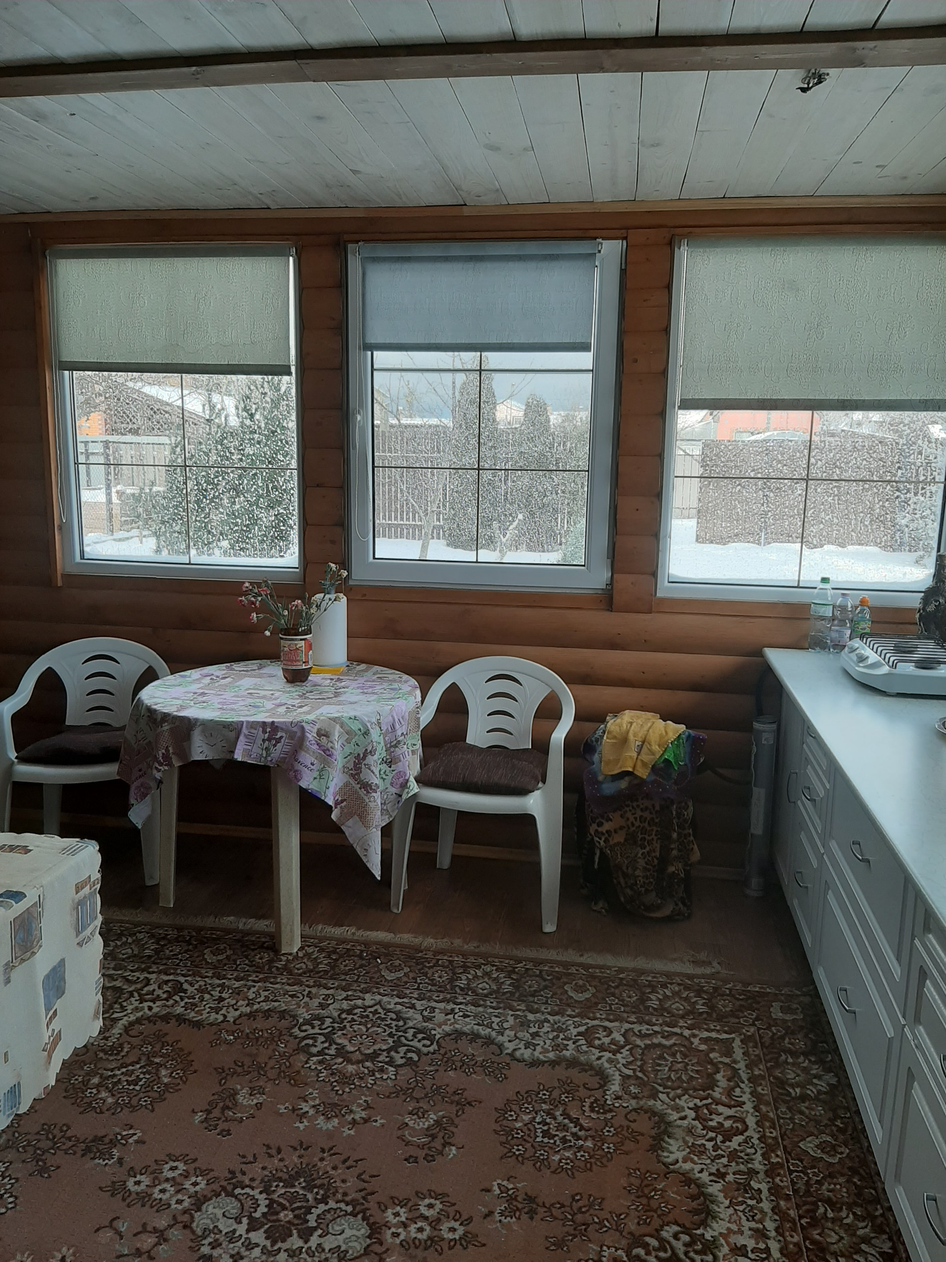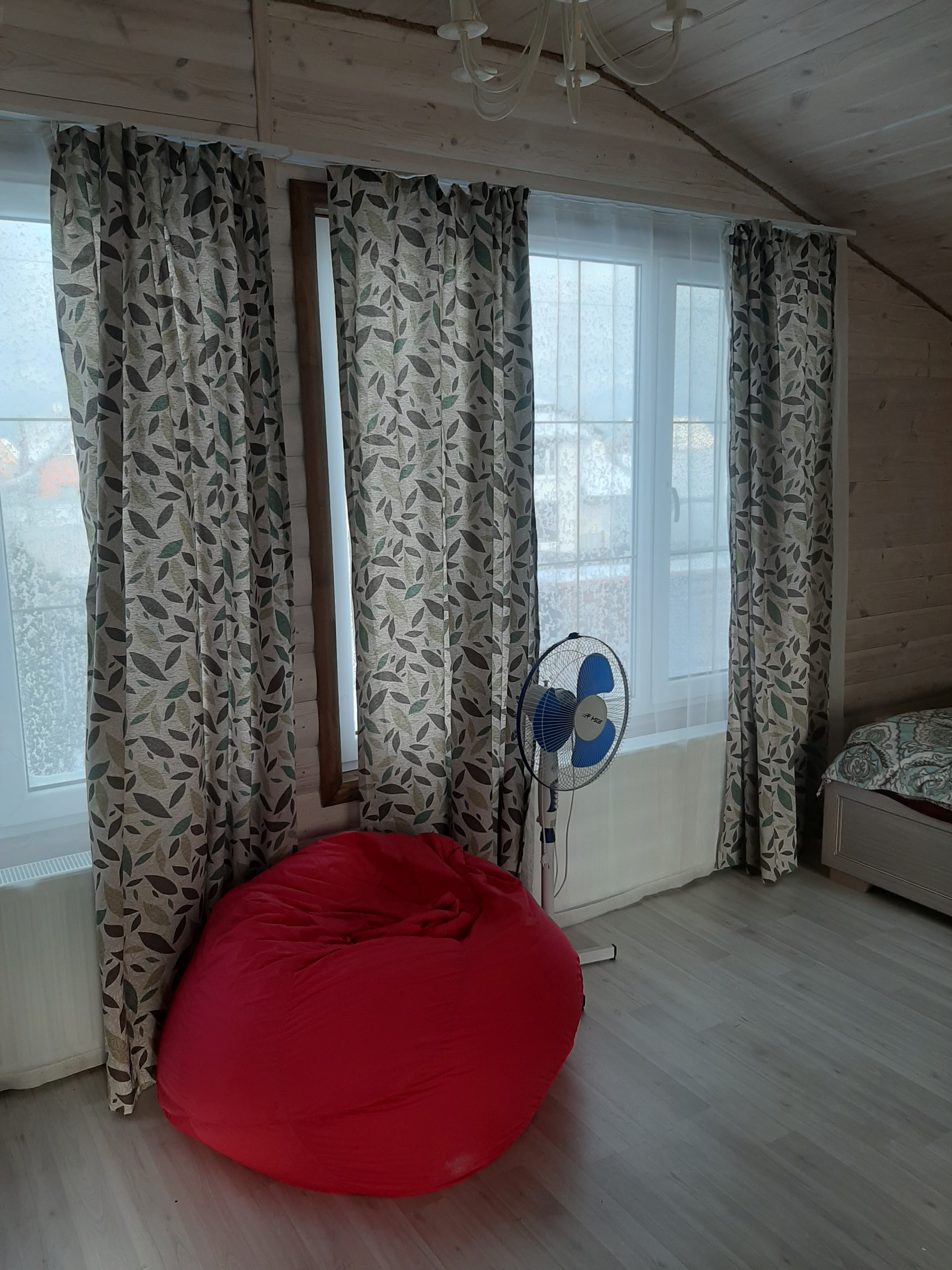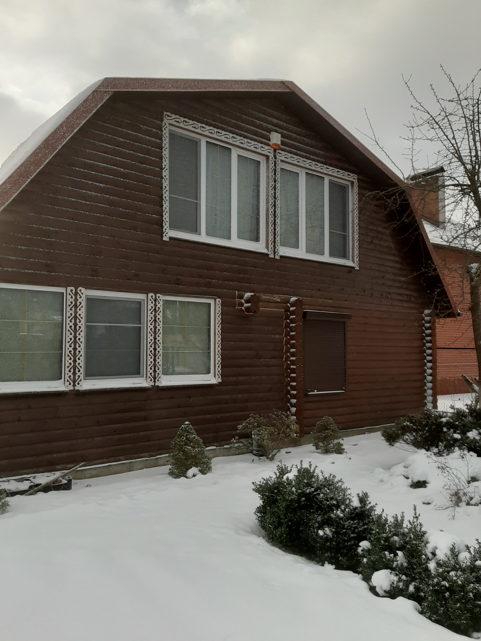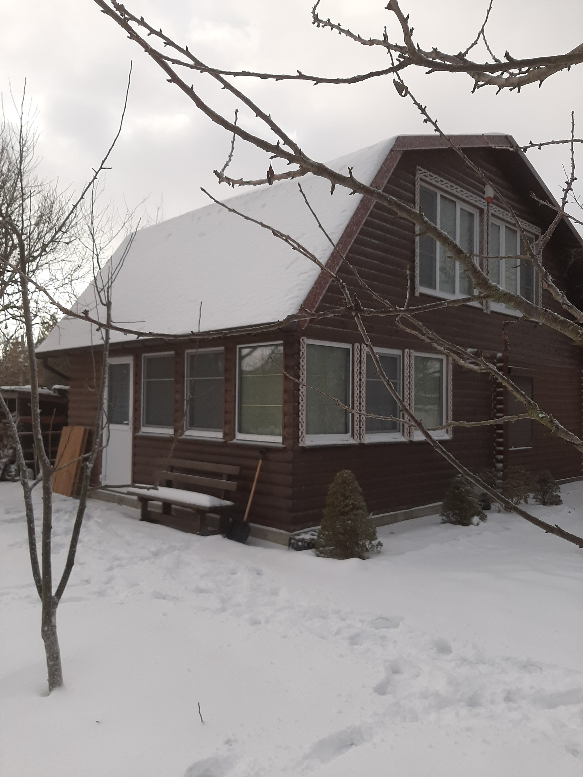 На первом этаже находится баня,комната отдыха и большая кухня-гостинная. На втором этаже - большая спальная с детским уголком, общей площадью 50кв.м.