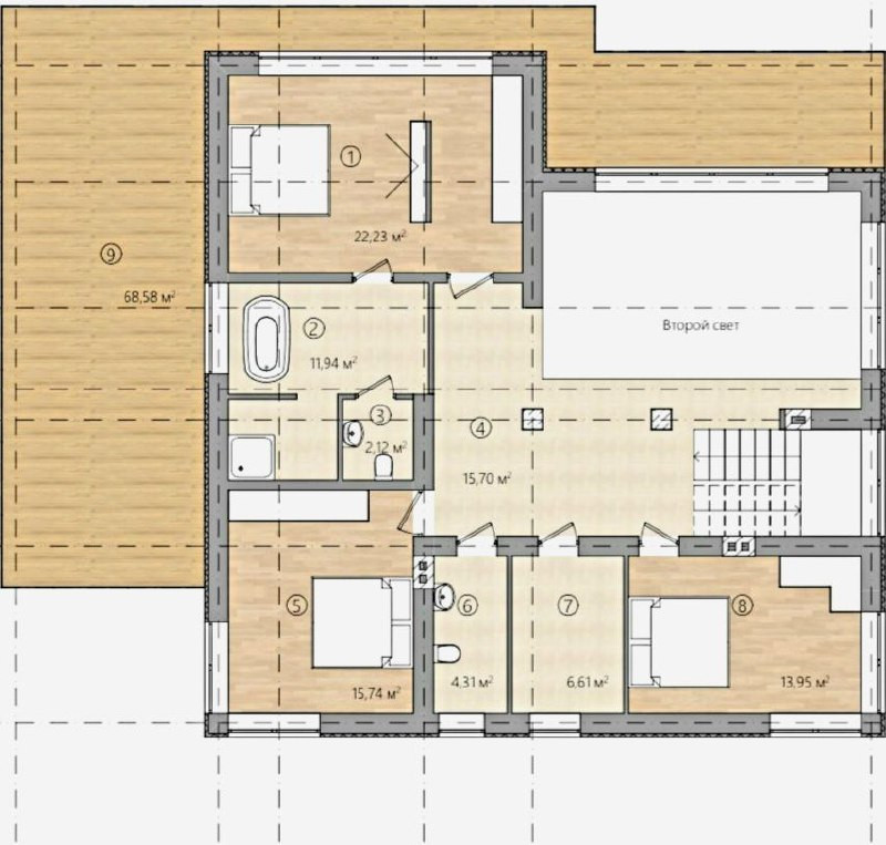 Планировка: 4 изолированные спальни, большая гостиная, просторная кухня, 3 санузла, отдельно сауна и ванная комната, гардеробная, комната отдыха, а также несколько технических помещений и терраса.