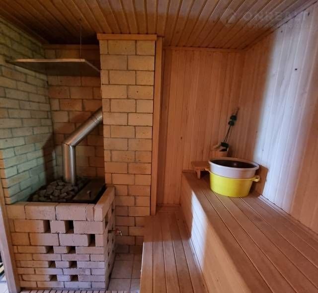 На первом этаже дома располагается кухня , зал с камином , сан.узел , душевая с сауной на дровах .