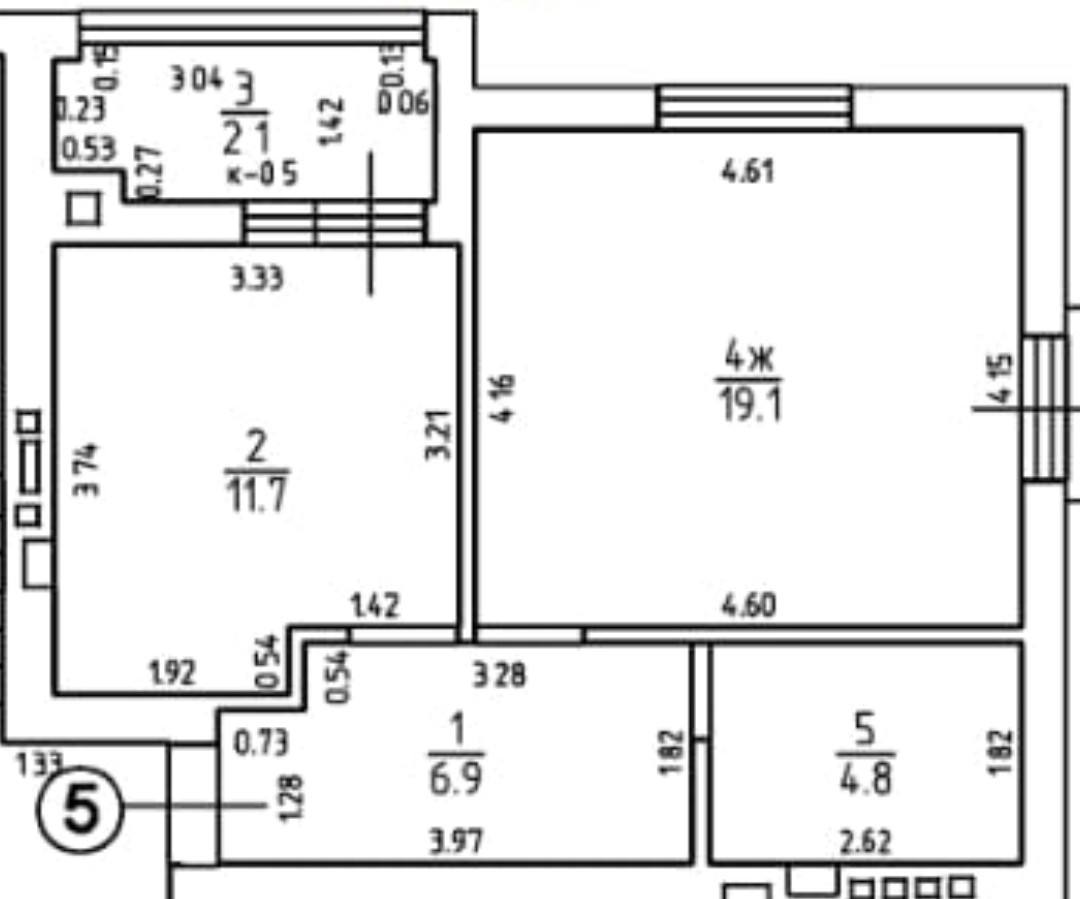 Общая площадь квартиры 46,7 кв.м, площадь комнаты 19,1 кв.м., площадь кухни 11,7 кв.м., лоджия 4,2 кв.м., санузел совмещённый 4,8 кв.м., коридор 6,9 кв.м.