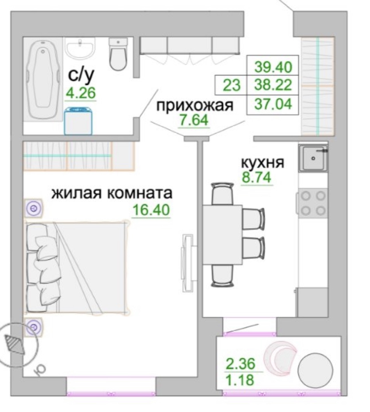 Общая площадь 39.2 м2