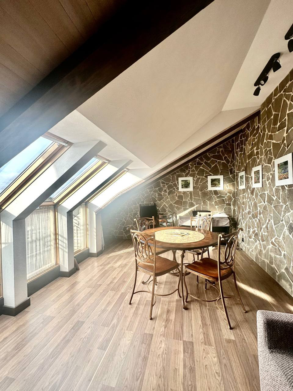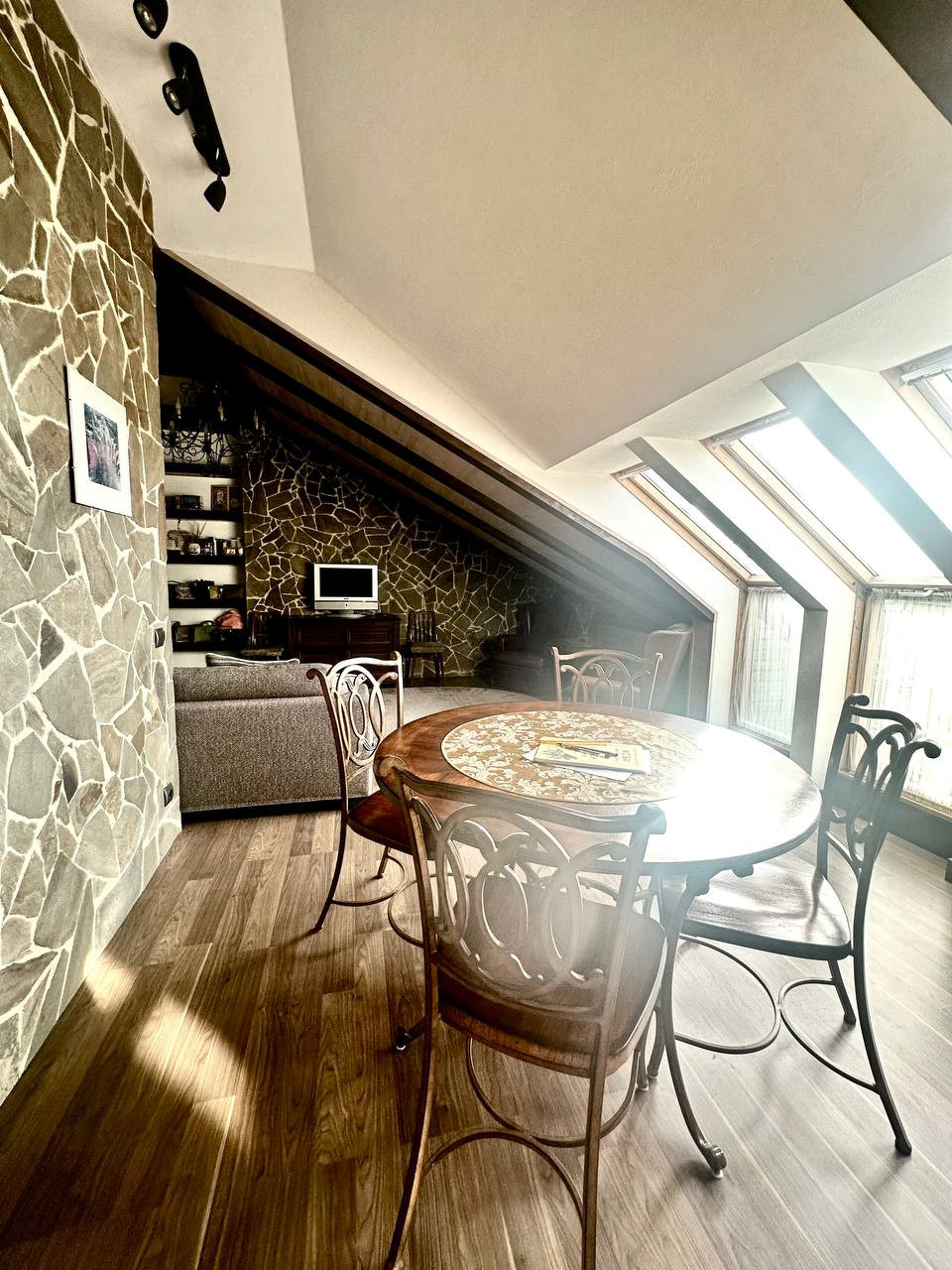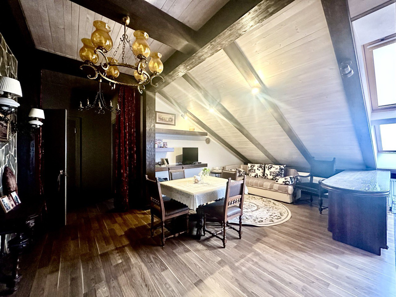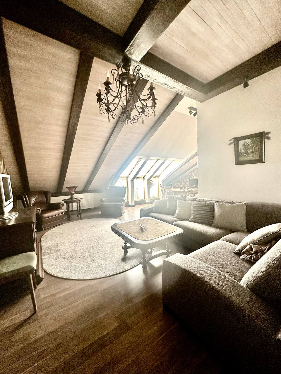 Большие мансардные окна дают много естественного освещения. Скосы крыши в сочетании с деревянной отделкой интерьера создают камерную атмосферу.