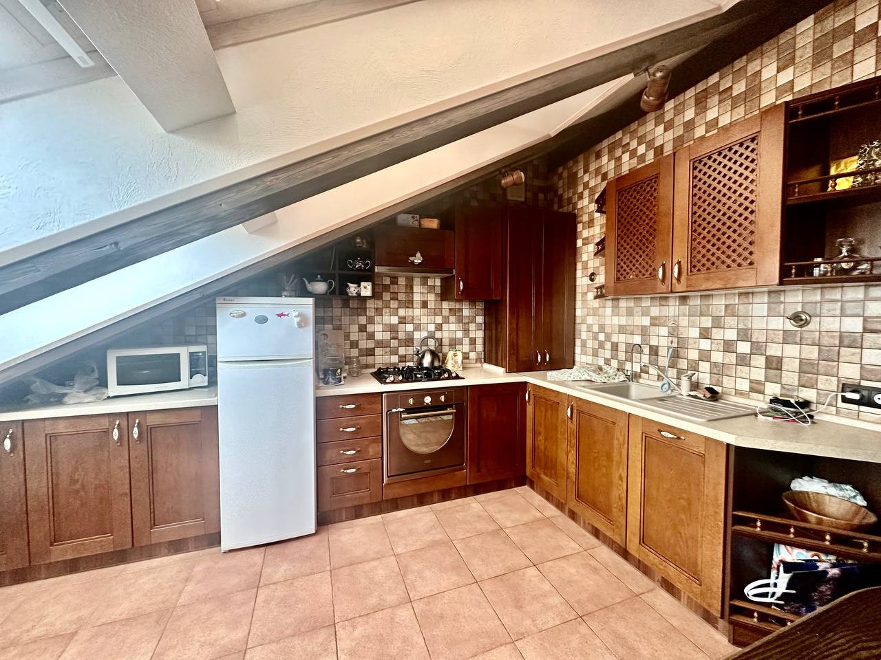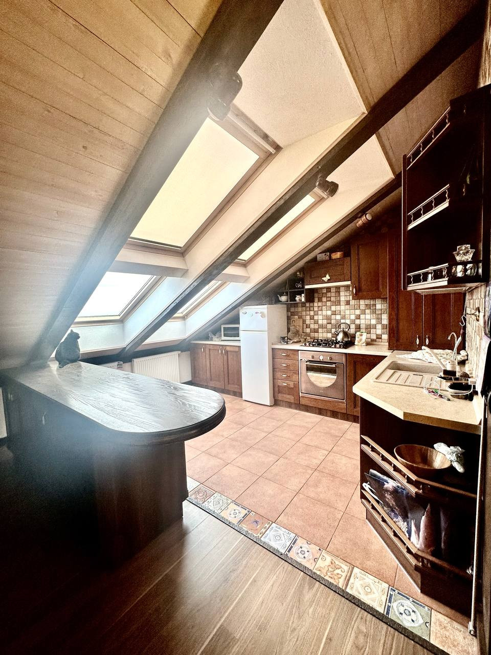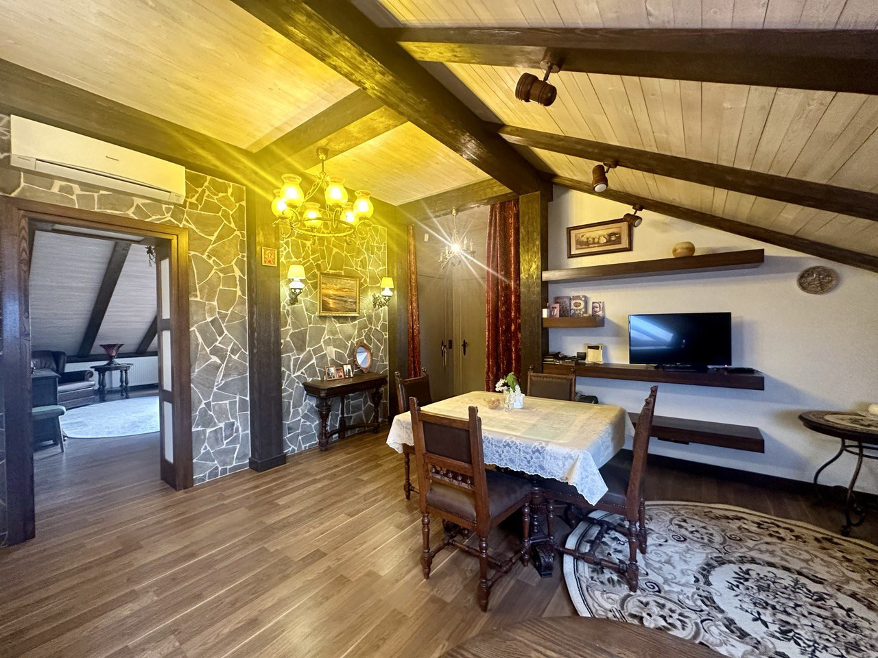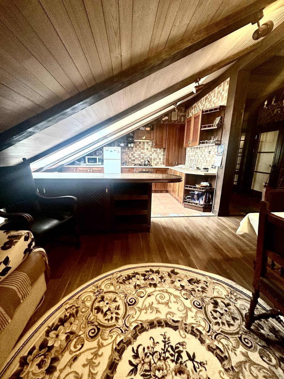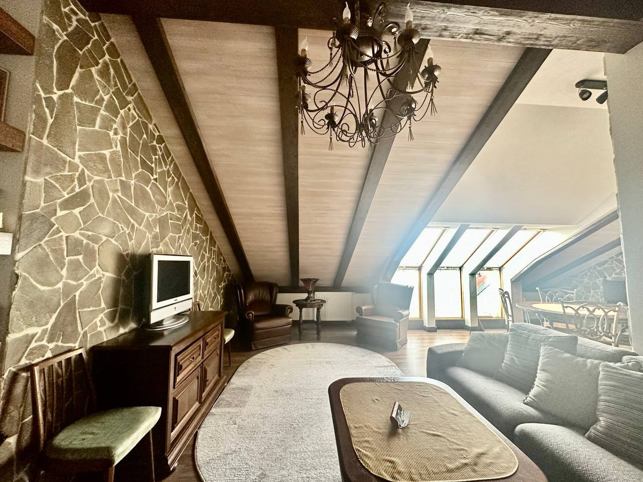 Большие мансардные окна дают много естественного освещения. Скосы крыши в сочетании с деревянной отделкой интерьера создают камерную атмосферу.