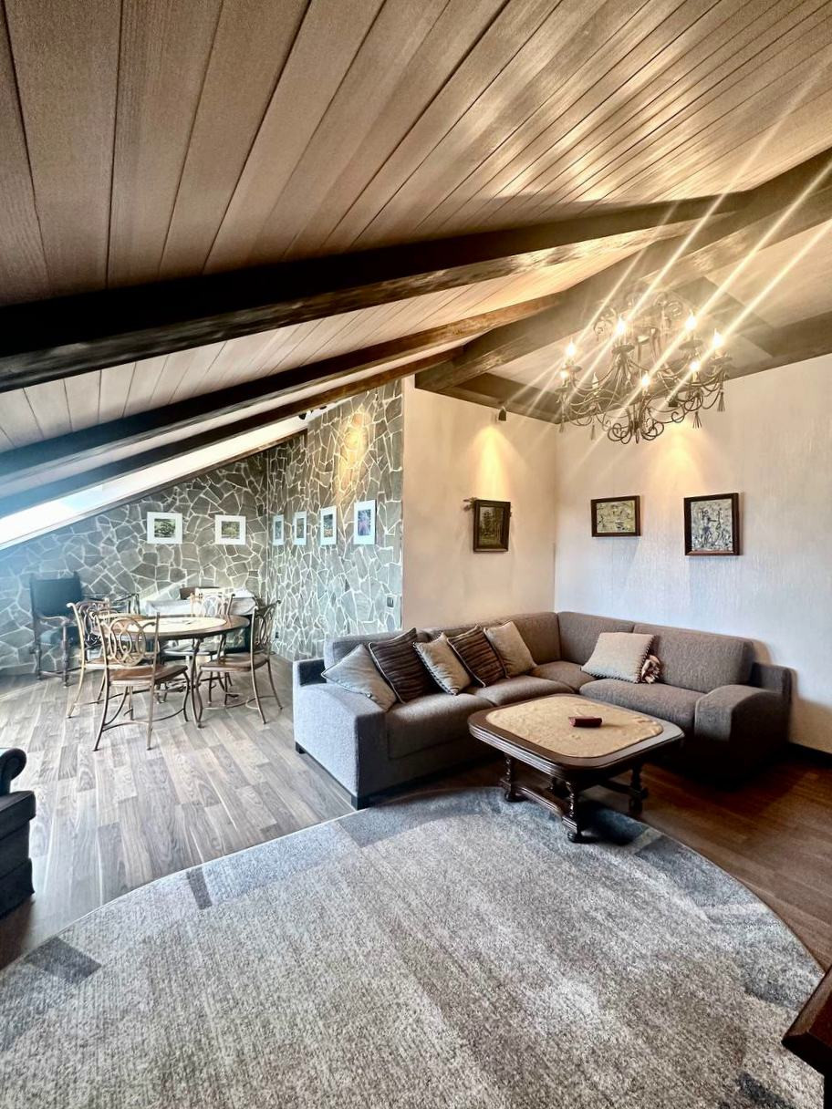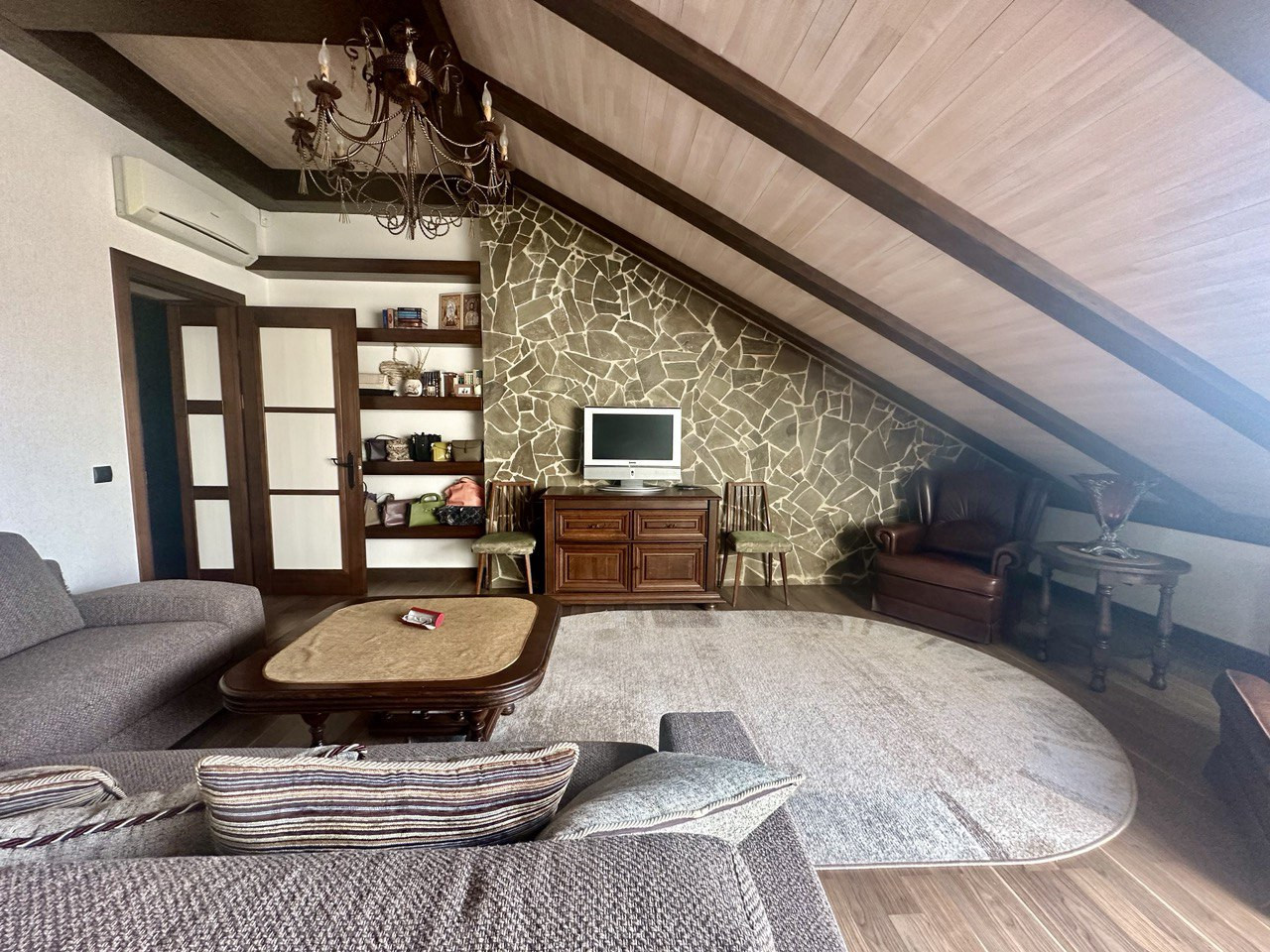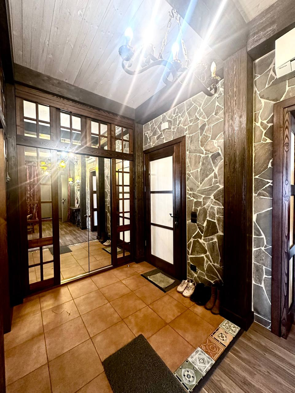 В отделке использованы натуральные материалы: дерево, камень. Много источников света.