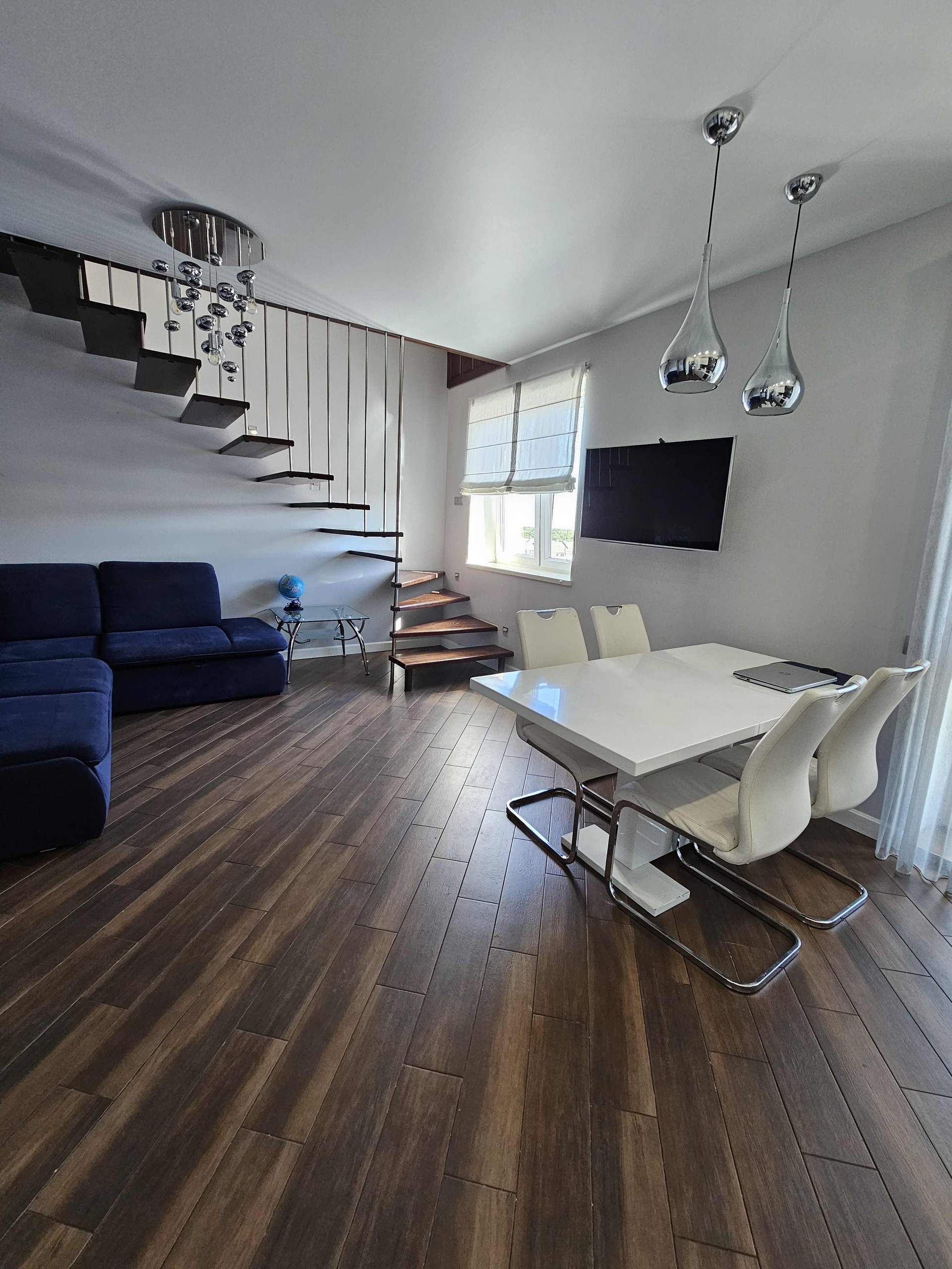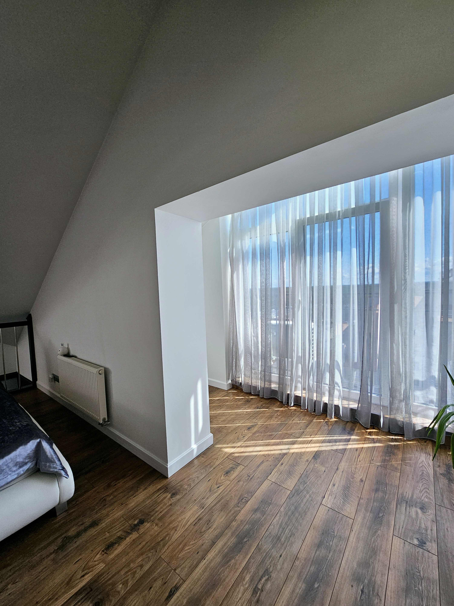 Помещение мансардное, широкое панорамное окно вертикальное, создаёт такое ощущение простора, словно Вы находитесь в особняке. Вид из окна на озеро, яркие крыши домов, деревья.
