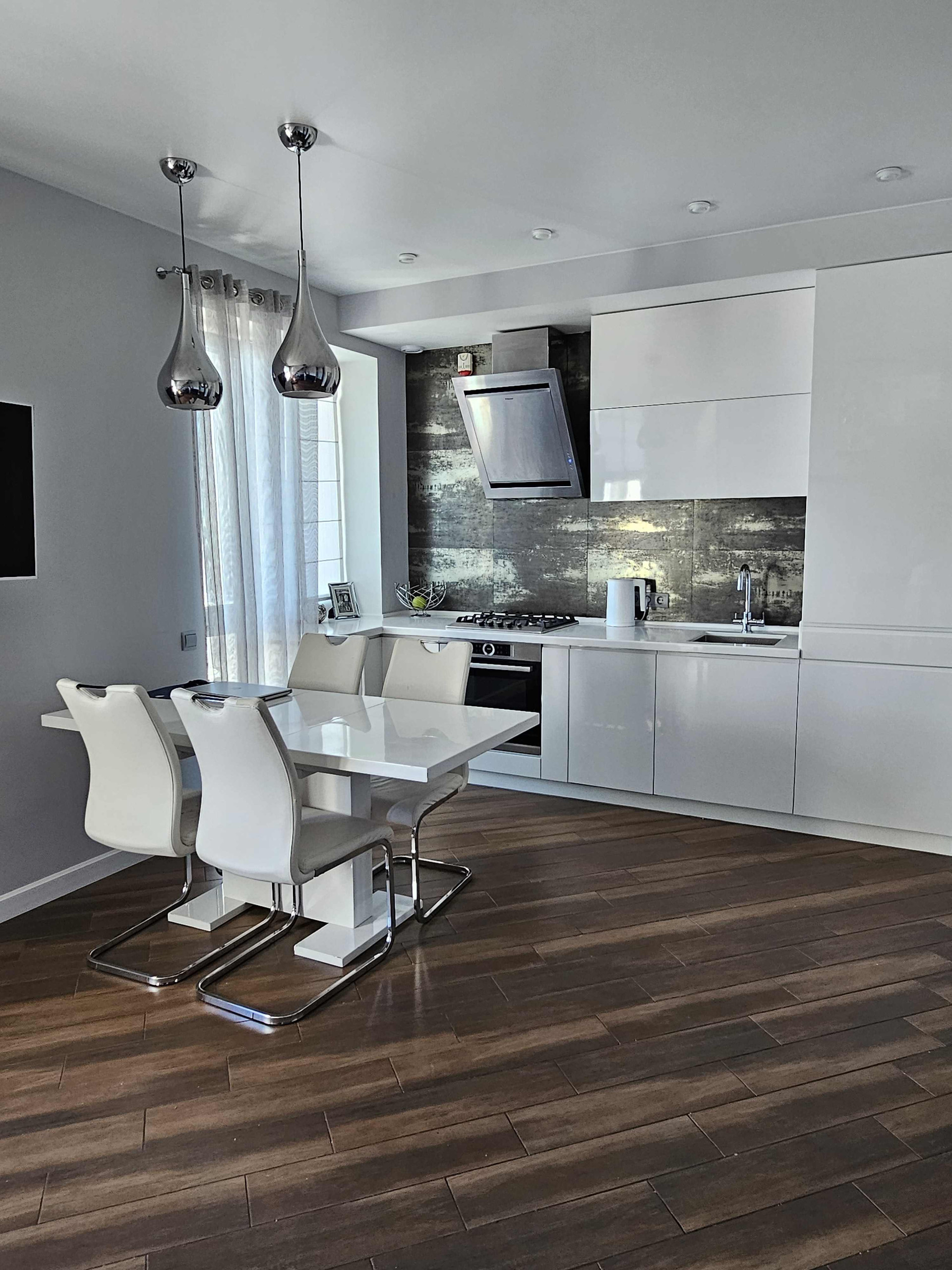 - просторная гостиная 25 м² с выходом на лоджию 4 м², оборудована бытовой техникой, встроенной кухонной мебелью. Угловой диван располагает к отдыху, а обеденный стол приглашает к изысканной трапезе