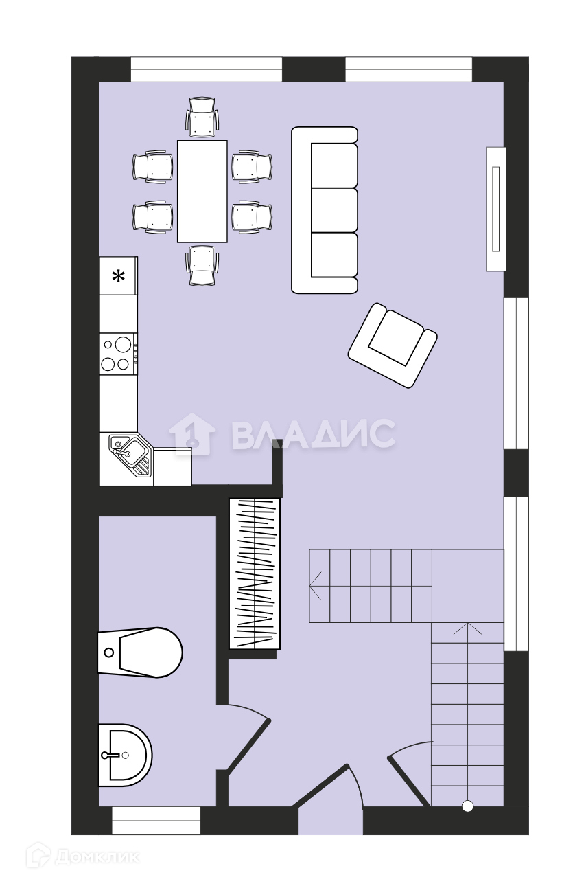 Первый этаж - холл, просторная кухня-гостиная 33 м2, гостевой санузел, выход на террасу.