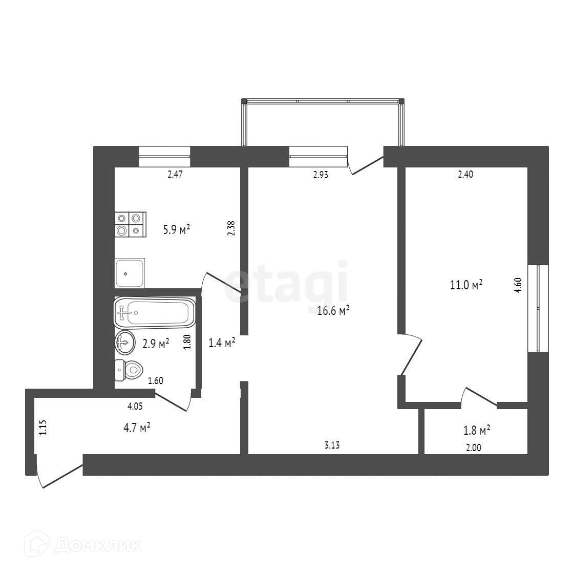 Общая площадь 44.5 м2