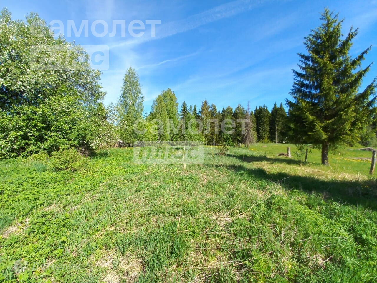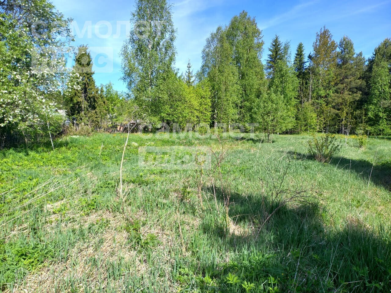 Участок ровный, прямоугольной формы.Есть насаждения: вишня, яблоня, кусты смородины, цветы!Также на границе участка растут ели, сосны!