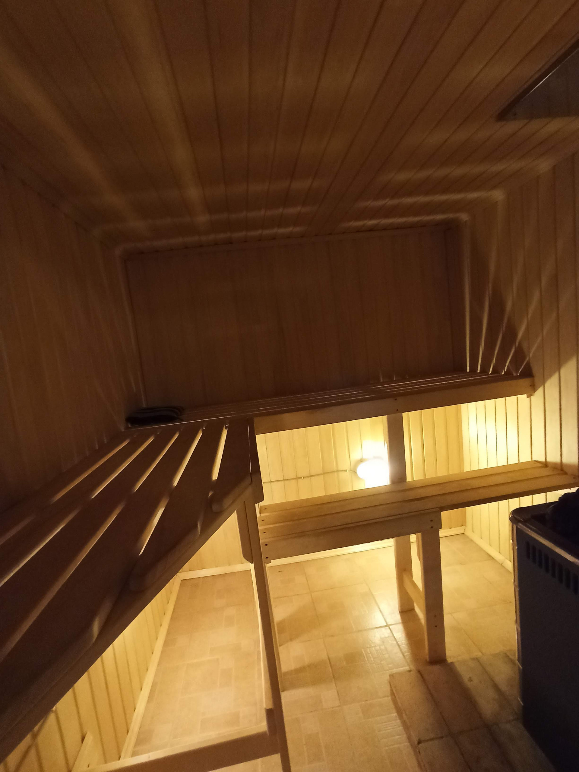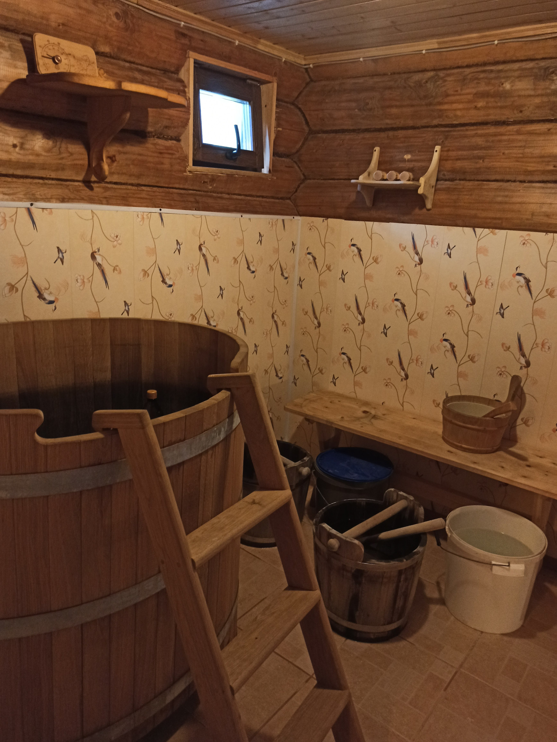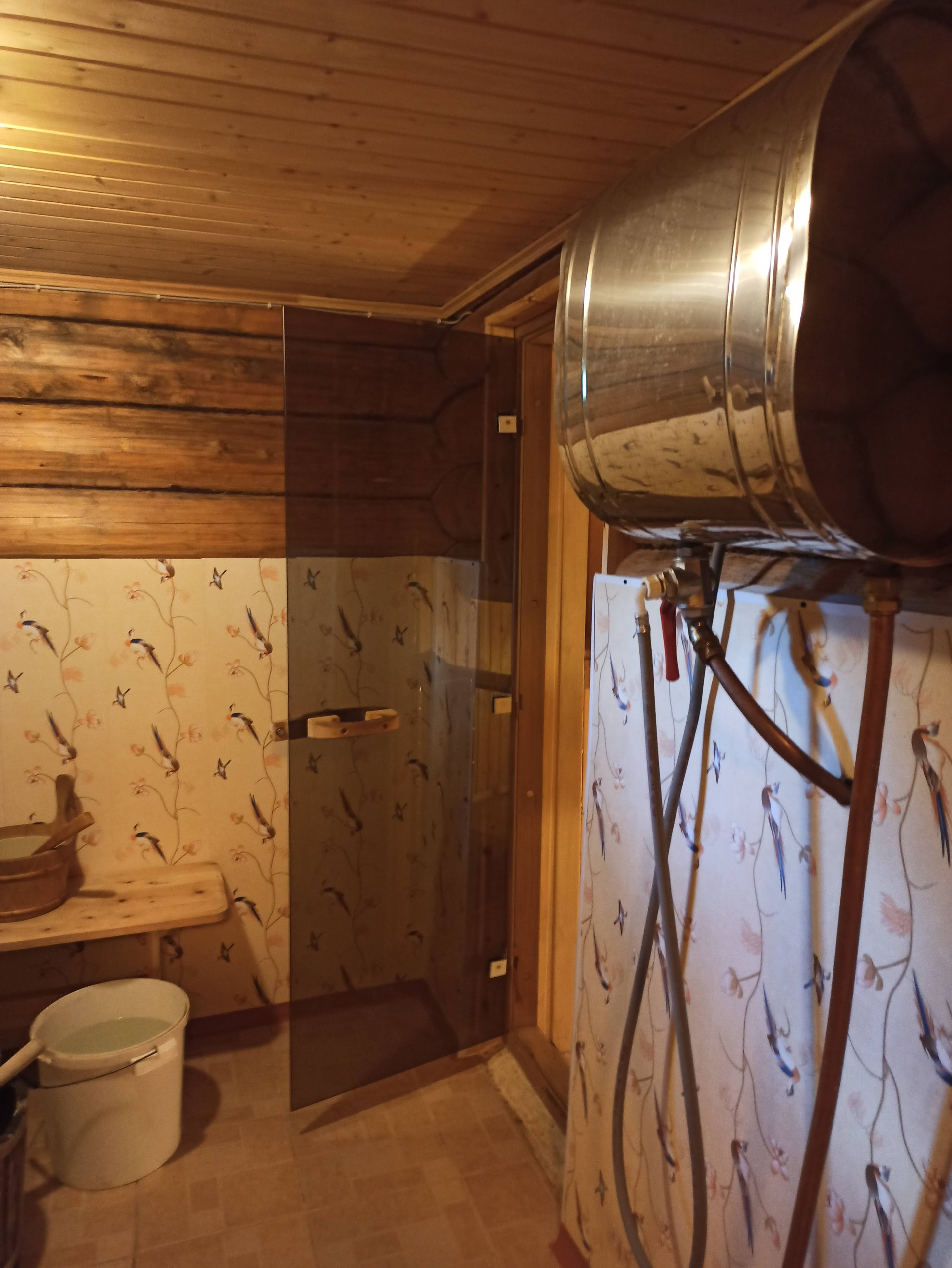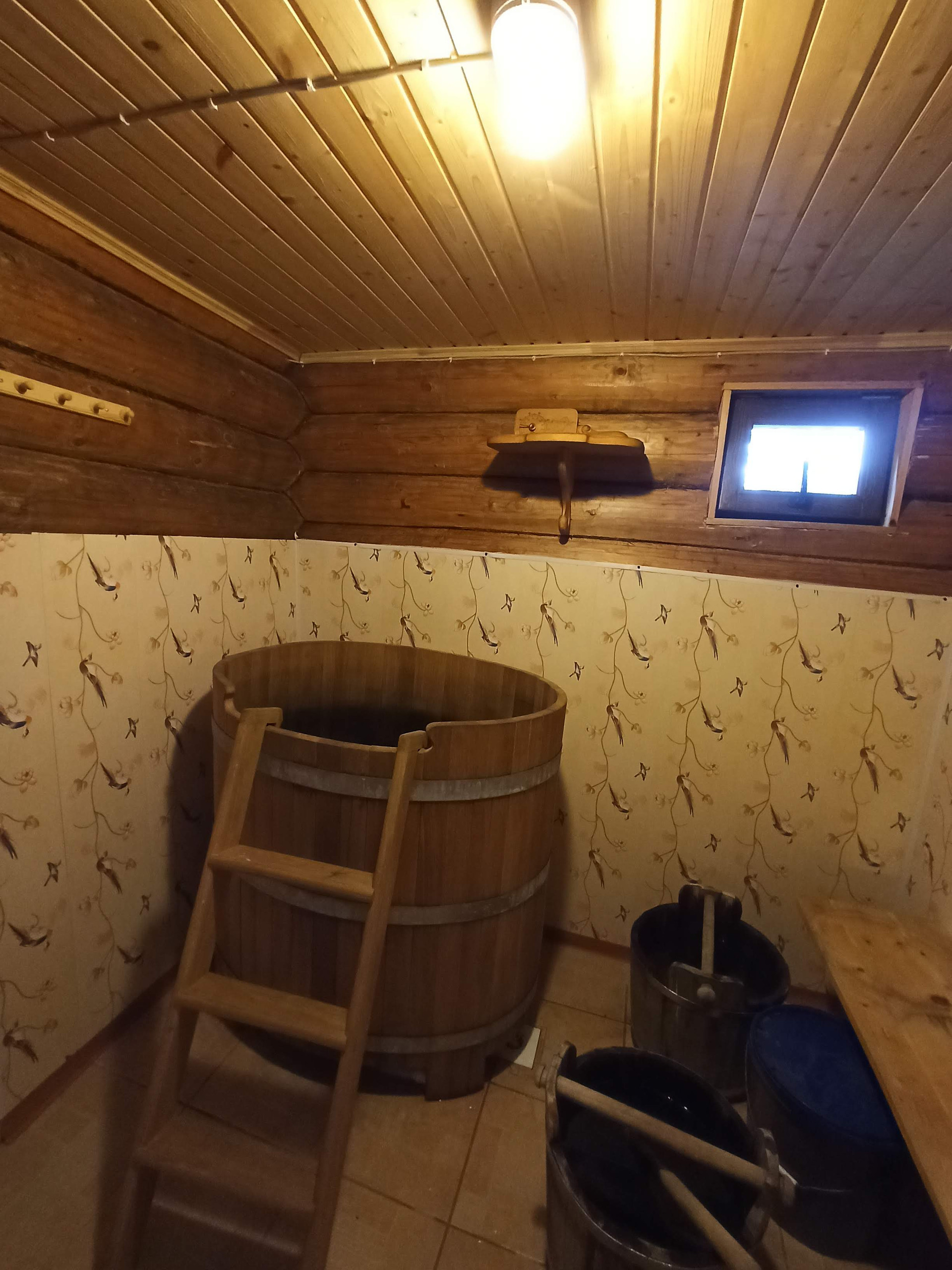 В бане дубовая бочка, бойлер, сауна из осины, обшитая деревом промывочная.