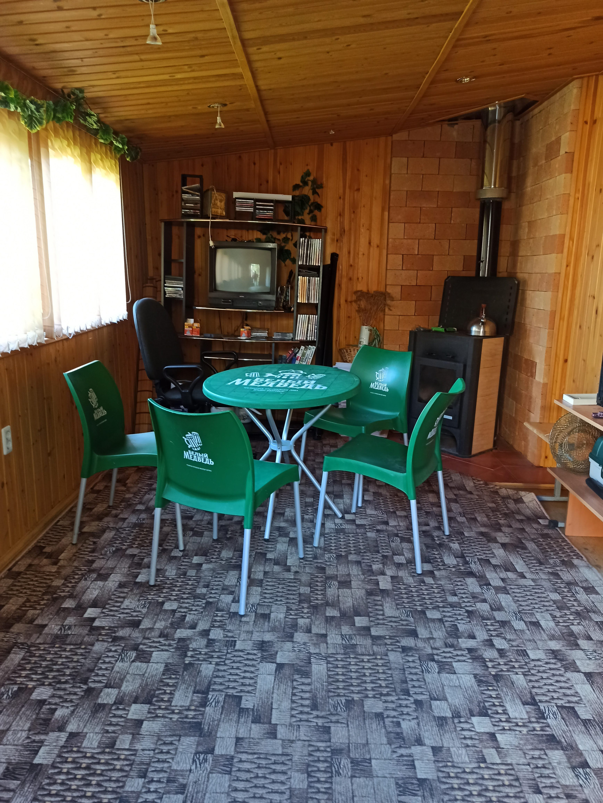 В гостевом доме большой стол, каминная плита.