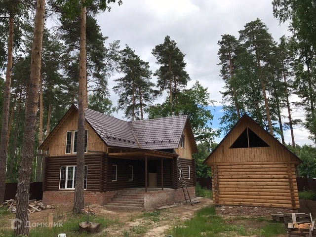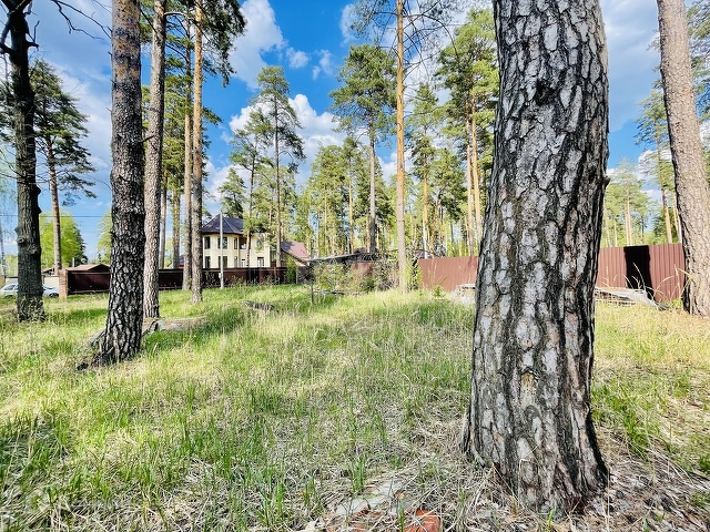 В престижном районе поселка продается земельный участок и дом, окруженный сосновыми деревьями.