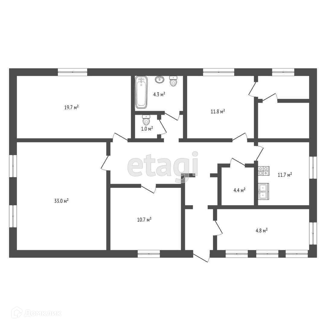 На первом этаже, площадь которого составляет 150 кв.м., расположены 4 комнаты, большая прихожая и просторная кухня, способная разместить даже самую большую семью. Есть подвал, по площади равный первому этажу.