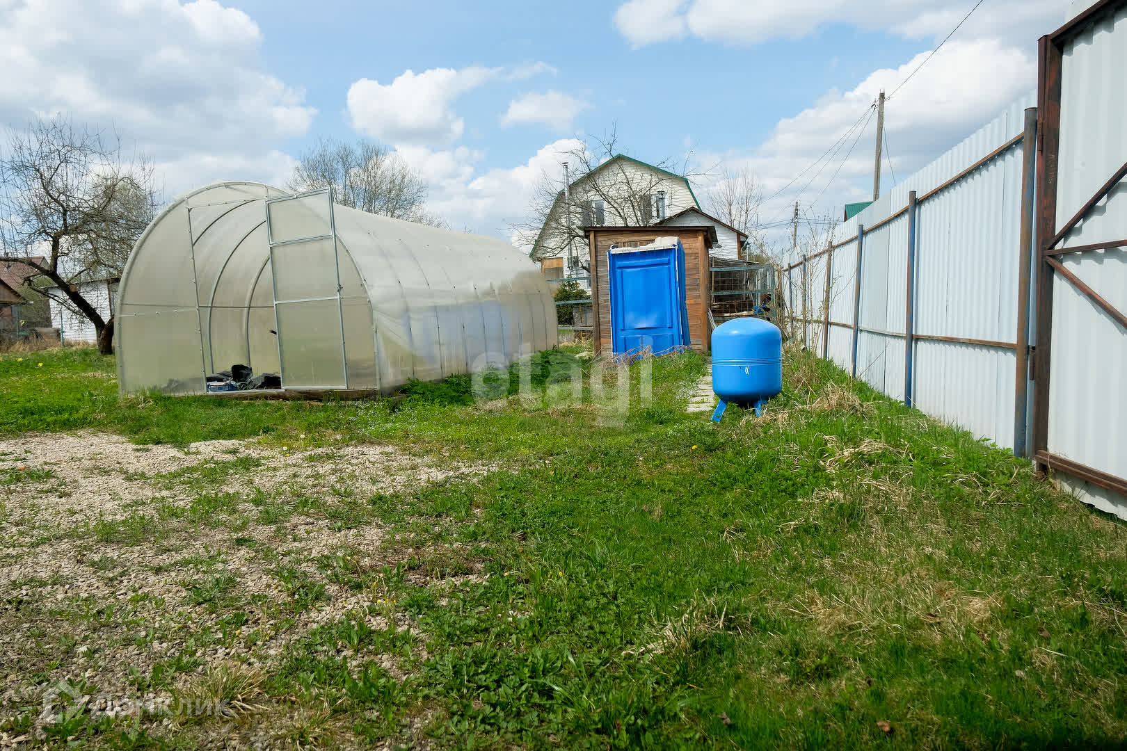 На участке стоит теплица и хозблок, где есть летний душ и есть место для диванчика.