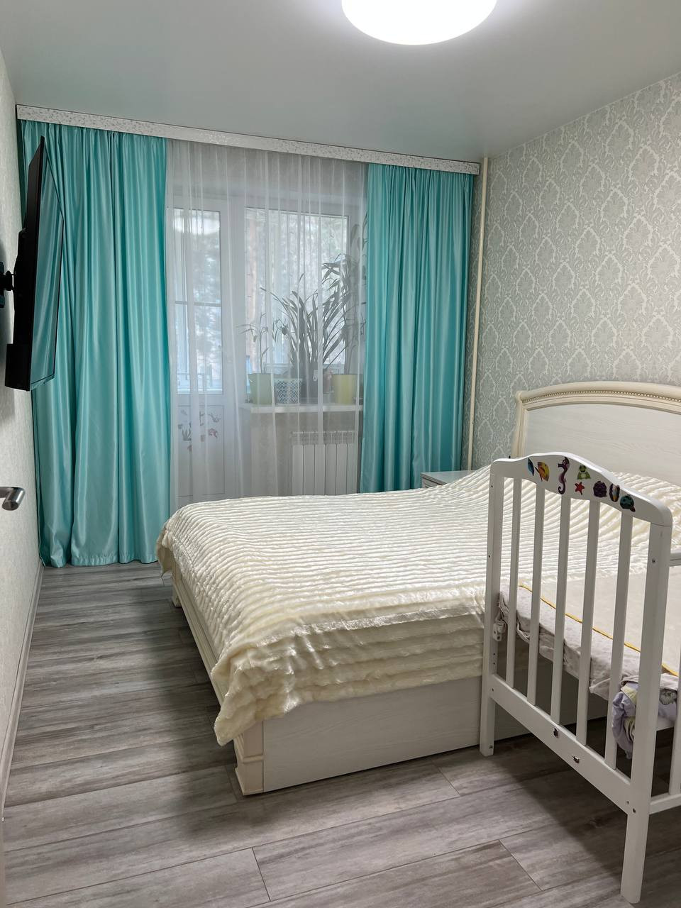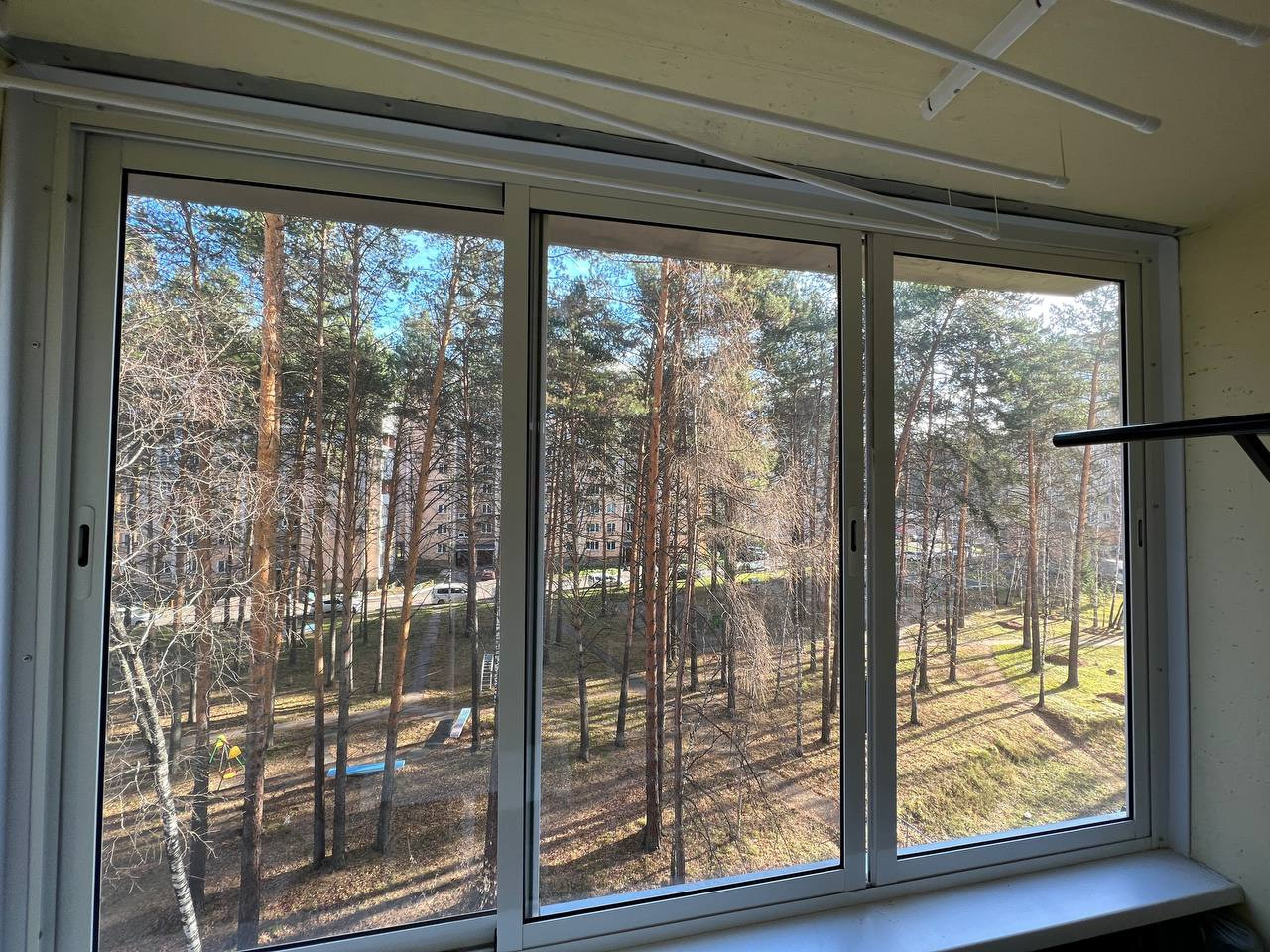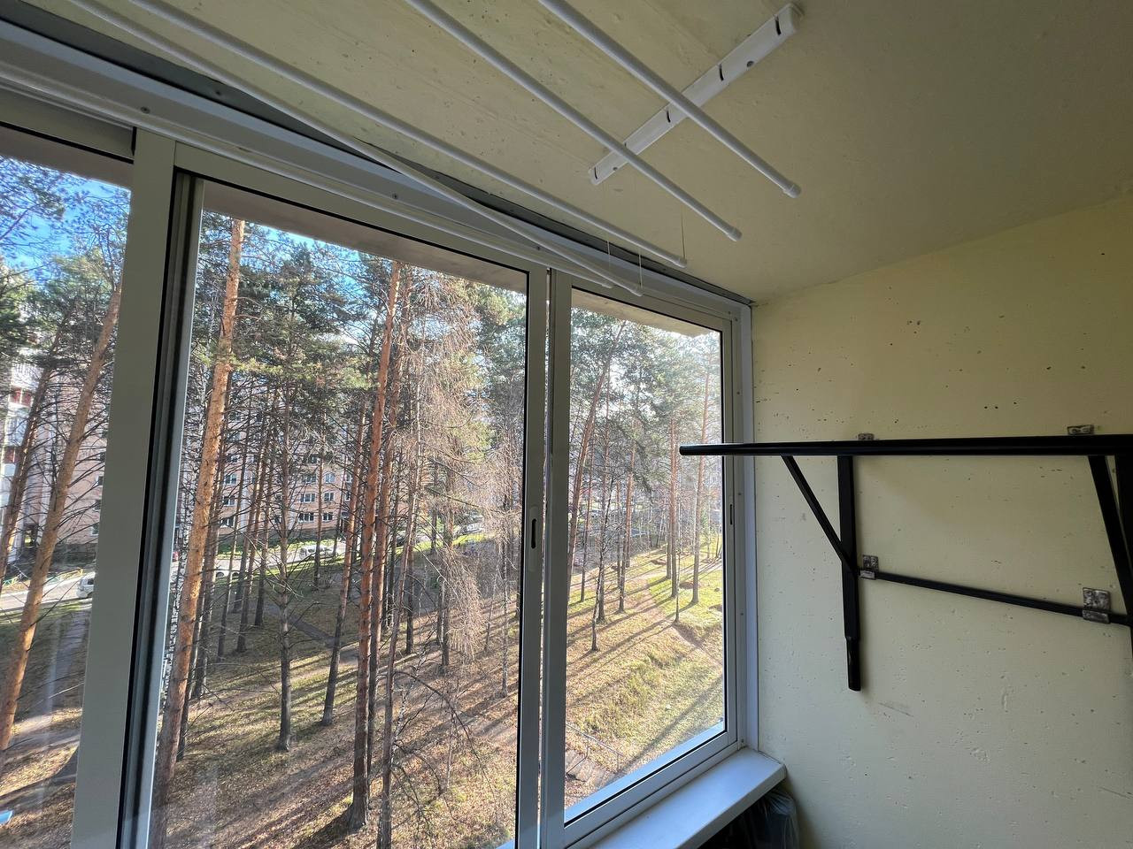 Новые окна ПВХ,балкон застеклен,с видом на лес,вдалеке от дороги и дворового подъезда. Квартира на одну сторону.