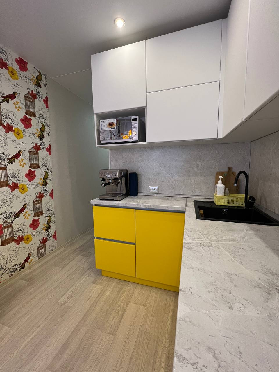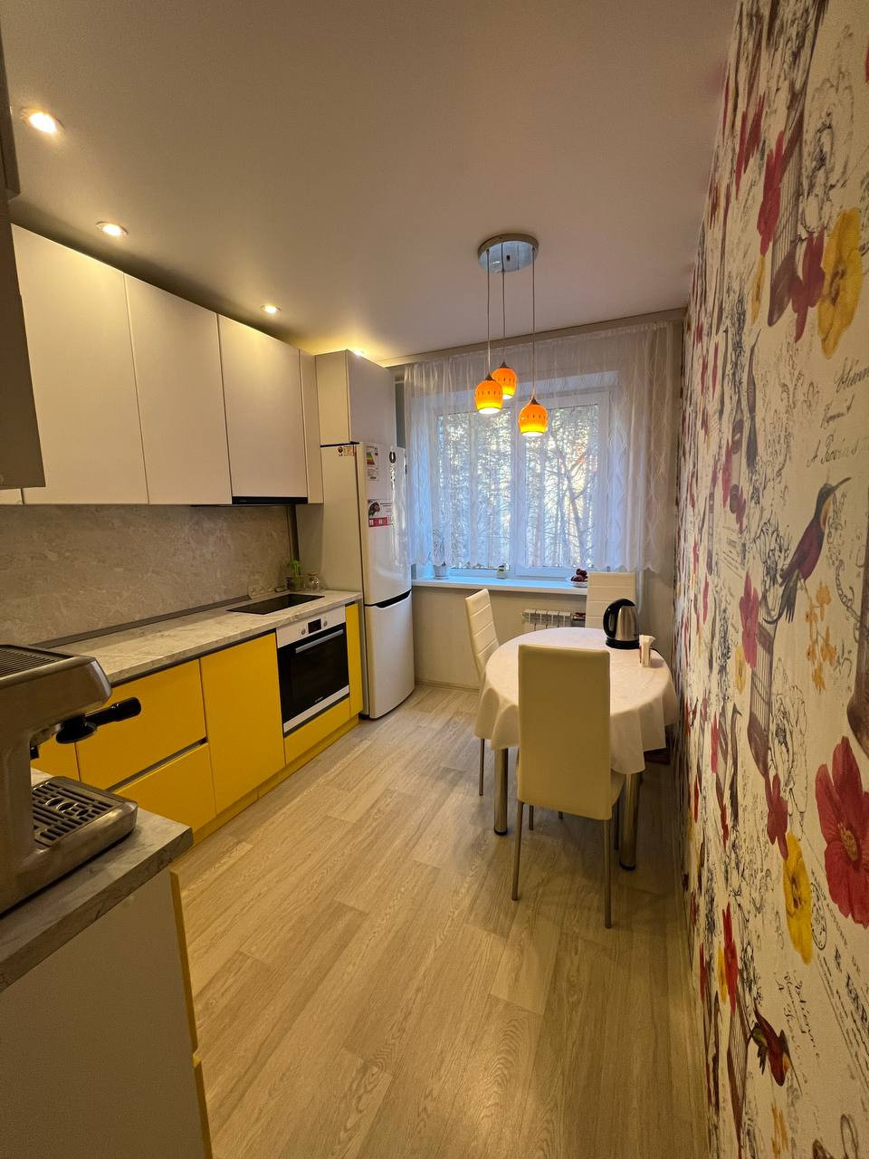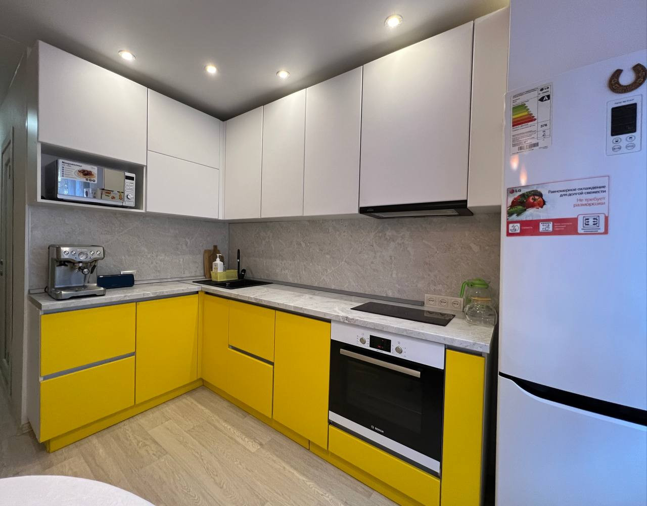 Современный кухонный гарнитур,со встроенной техникой. Под каждую технику выведена своя розетка. Под каждый телевизор выведена розетка с антенной. Также в прихожей выведен интернет кабель для роутера. Никаких лишних проводов.