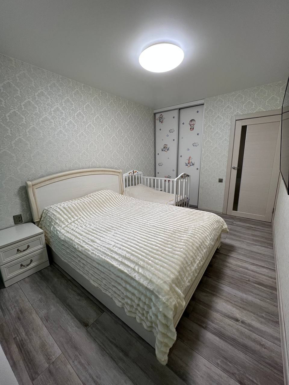 Натяжные потолки во всей квартире. Дорогие виниловые обои. В гостиной и в спальне дорогой ламинат(Бельгия и Германия). В коридоре и кухне теплый линолеум Таркетт.