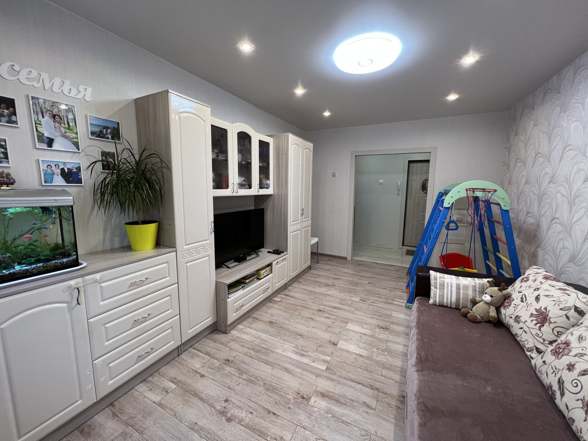 Установлена входная дверь,с хорошей шумоизоляцией. Межкомнатные двери и арка в гостиной экошпон.