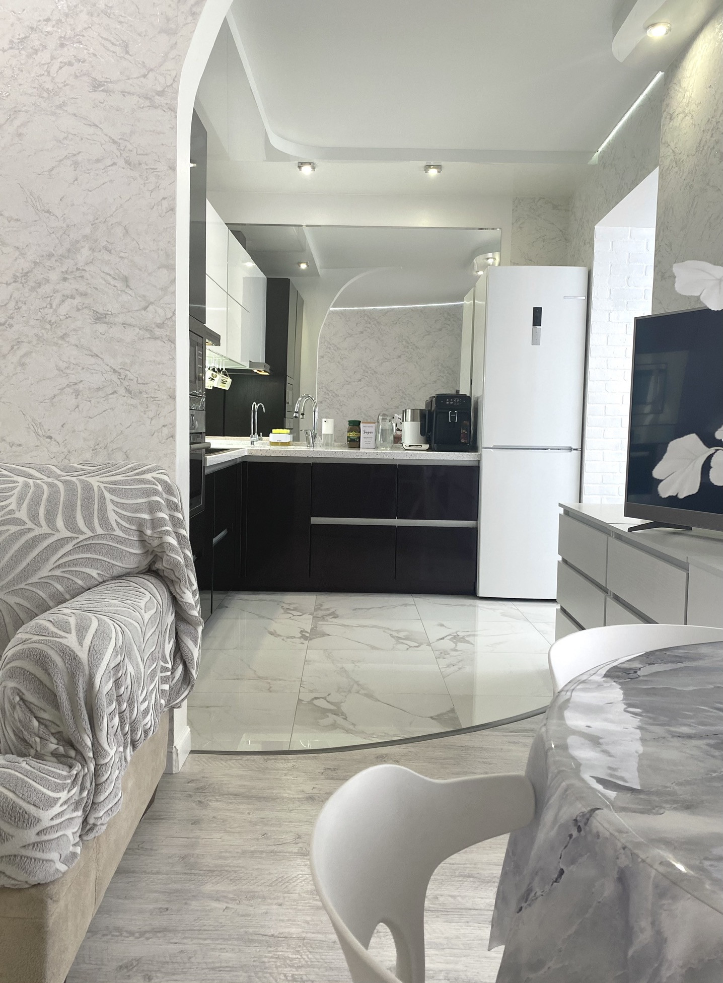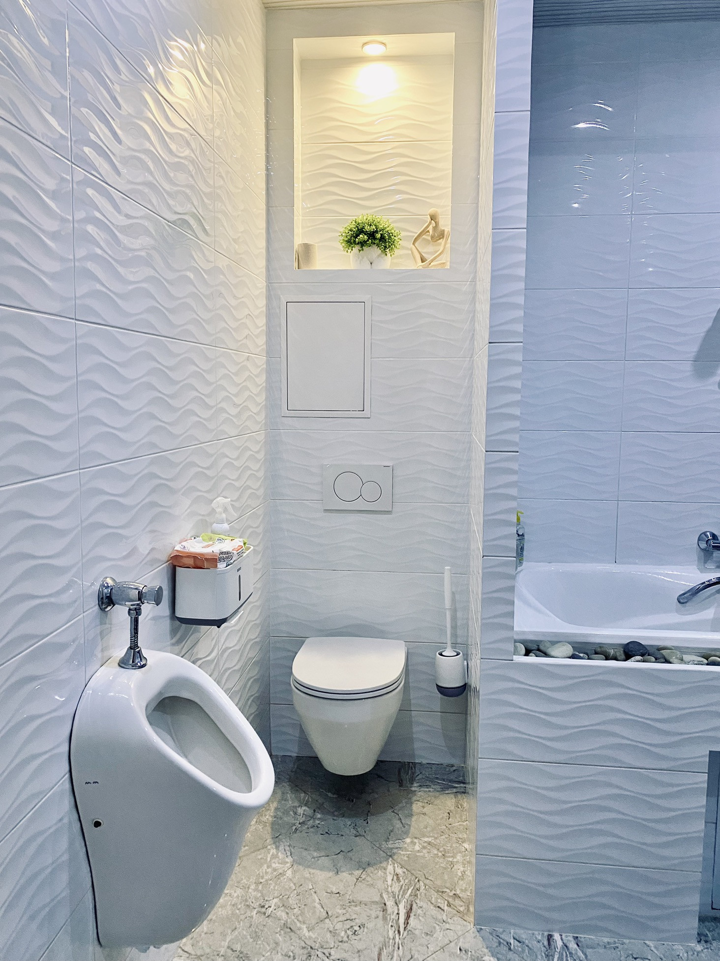 Санузел совмещен и расширен за счет коридора, полы с подогревом. Вся сантехника новая.