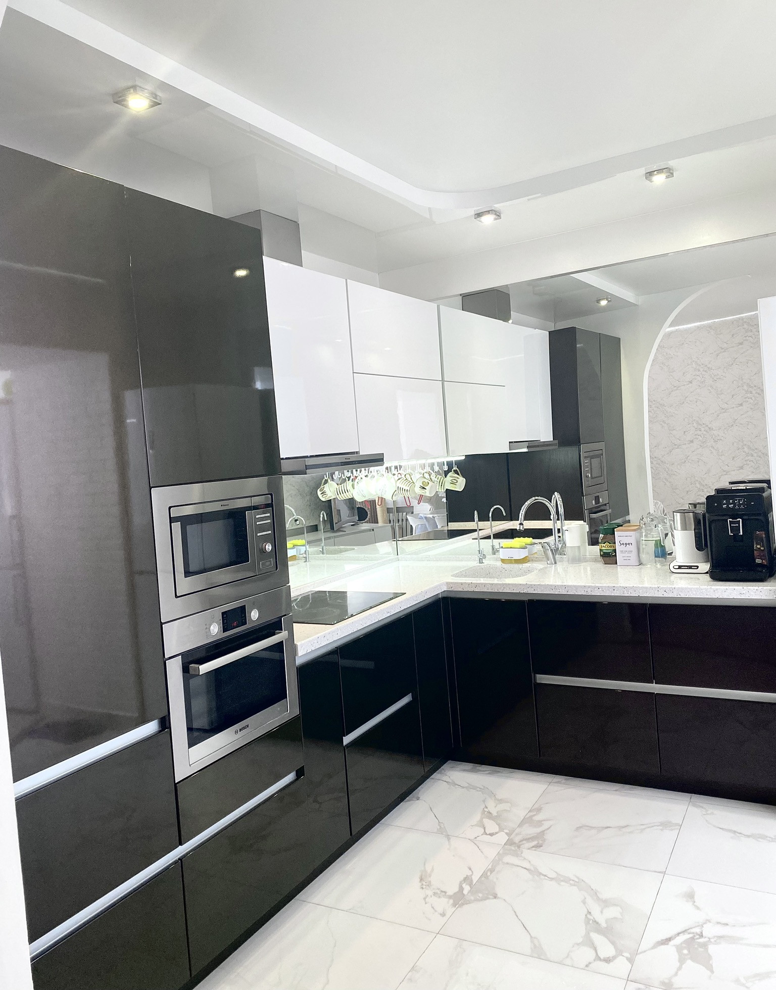 Кухонный гарнитур со столешницей и мойкой из камня, встроенные эл.плита BOSCH, м/в печь Hansa, вытяжка Hansa и дух. шкаф  BOSCH…остаются.