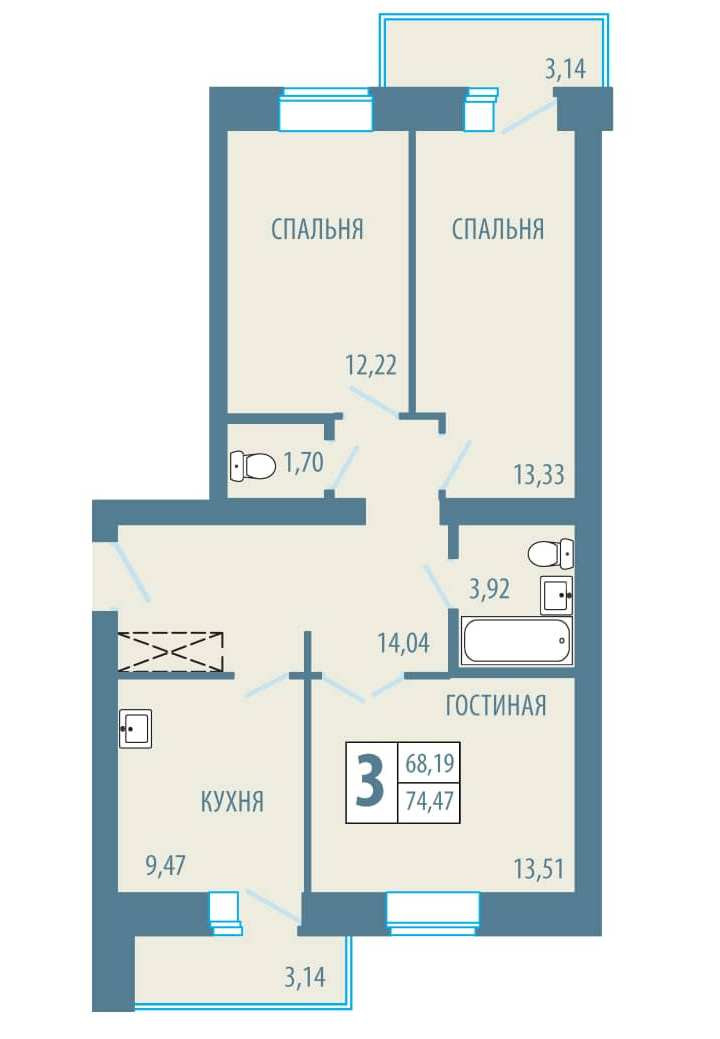 Общая площадь 74.4 м2