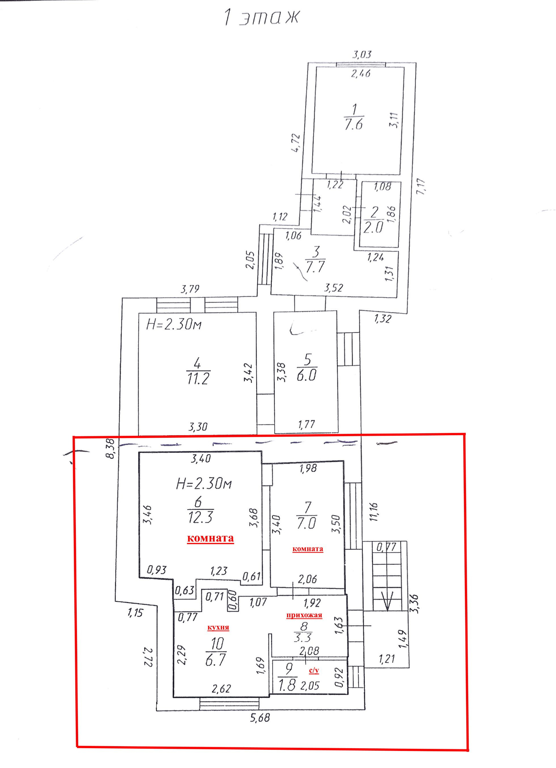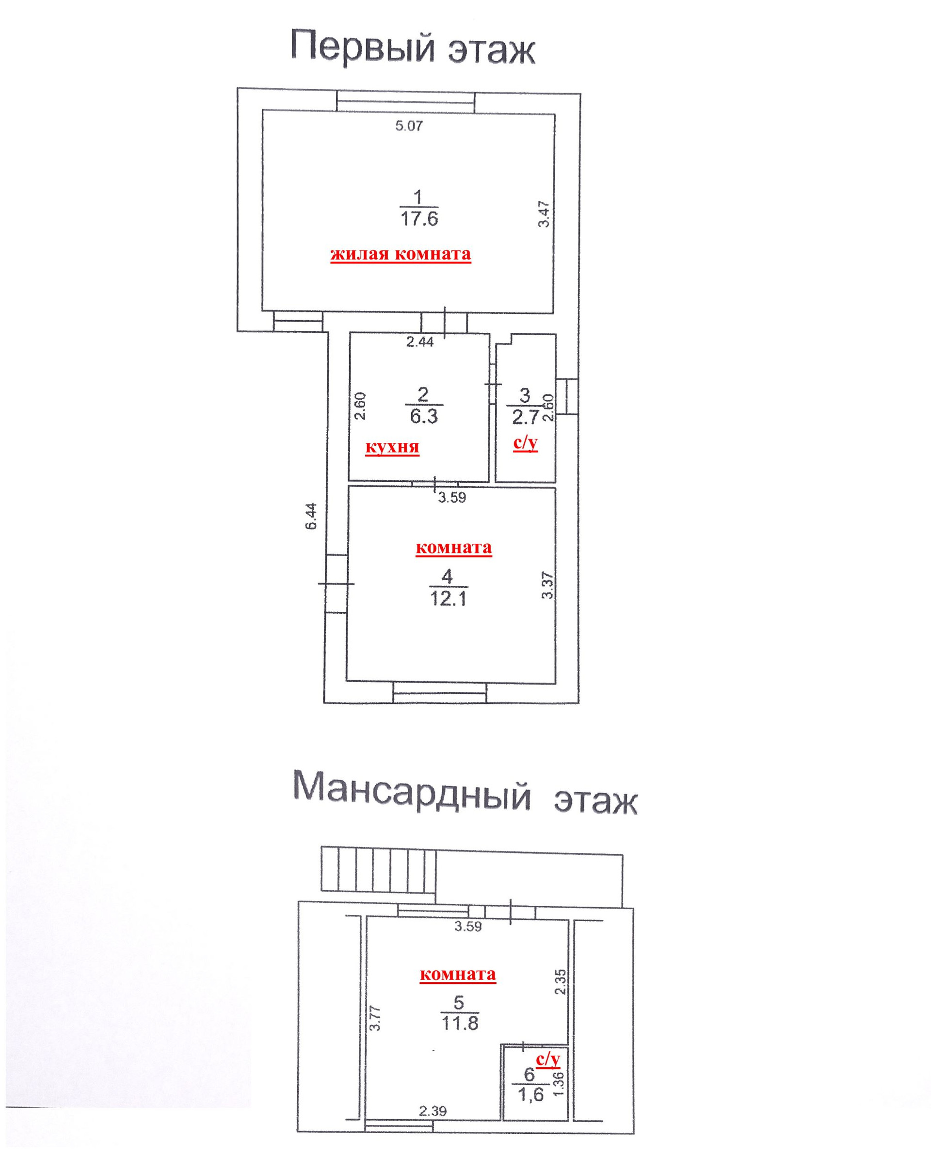 - отдельно стоящий дом общей площадью 52 кв.м.: жилая комната 17,6 кв.м., прихожая 12 кв.м., кухня 6,3 кв.м., совмещённый санузел 2,7 кв.м., на мансарде жилое помещение 11,8 кв.м. со своим санузлом 1,6 кв.м.