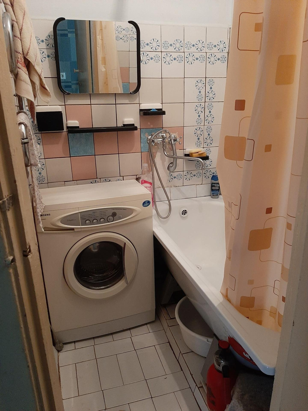 Везде линолеум, ванна и туалет плитка.
